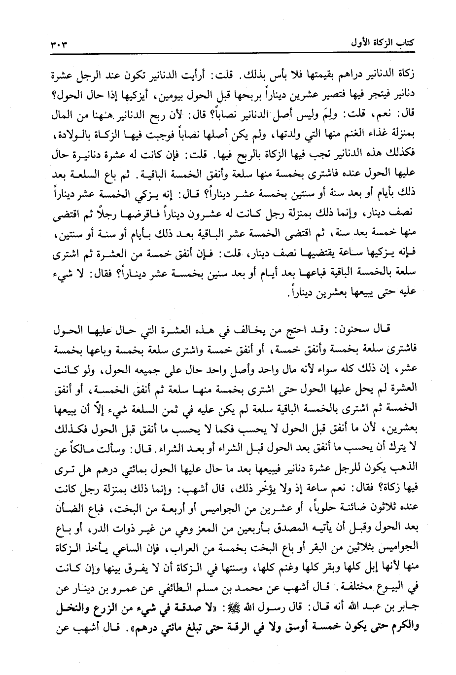 قُلْتُ: فَإِنْ كَانَتْ لَهُ عَشَرَةُ دَنَانِيرَ حَالَ عَلَيْهَا الْحَوْلُ عِنْدَهُ فَاشْتَرَى بِخَمْسَةٍ مِنْهَا سِلْعَةً وَأَنْفَقَ الْخَمْسَةَ الْبَاقِيَةَ. ثُمَّ بَاعَ السِّلْعَةَ بَعْدَ ذَلِكَ بِأَيَّامٍ أَوْ بَعْدَ سَنَةٍ أَوْ سَنَتَيْنِ بِخَمْسَةَ عَشَرَ دِينَارًا؟