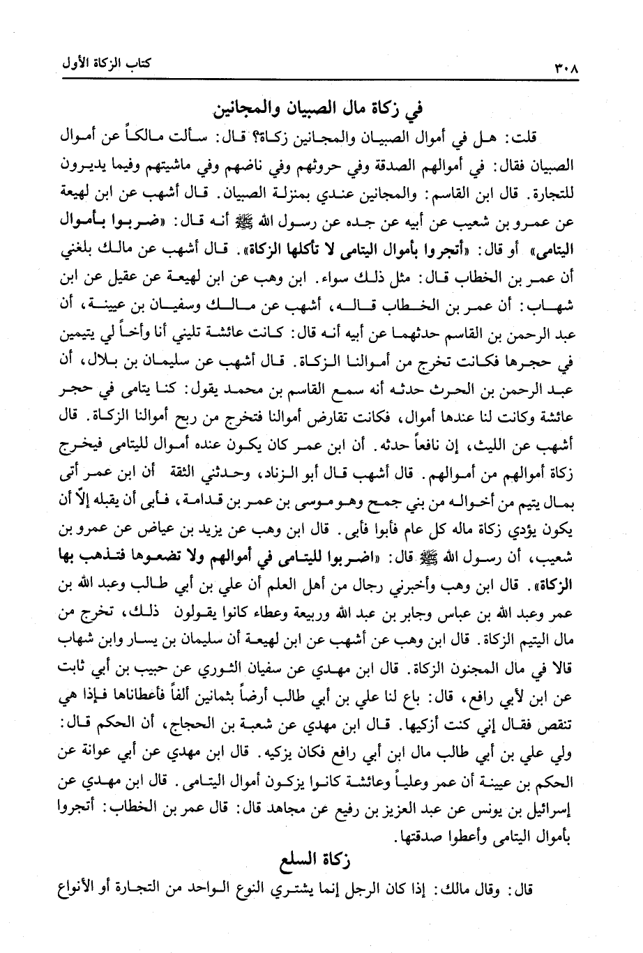 قَالَ: سَأَلْتُ مَالِكًا عَنْ أَمْوَالِ الصِّبْيَانِ فَقَالَ: فِي أَمْوَالِهِمْ الصَّدَقَةُ وَفِي حُرُوثِهِمْ وَفِي نَاضِّهِمْ وَفِي مَاشِيَتِهِمْ وَفِيمَا يُدِيرُونَ لِلتِّجَارَةِ.