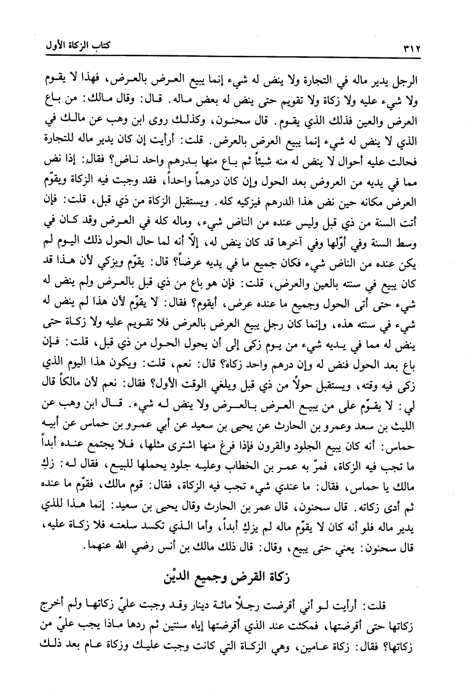 قُلْتُ: وَيَكُونُ هَذَا الْيَوْمُ الَّذِي زَكَّى فِيهِ وَقْتَهُ، وَيَسْتَقْبِلُ حَوْلًا مِنْ ذِي قَبْلٍ وَيُلْغِي الْوَقْتَ الْأَوَّلَ؟ فَقَالَ: نَعَمْ؛ لِأَنَّ مَالِكًا قَالَ لِي: لَا يُقَوِّمُ عَلَى مَنْ يَبِيعُ الْعَرَضَ بِالْعَرَضِ وَلَا يَنِضُّ لَهُ شَيْءٌ.