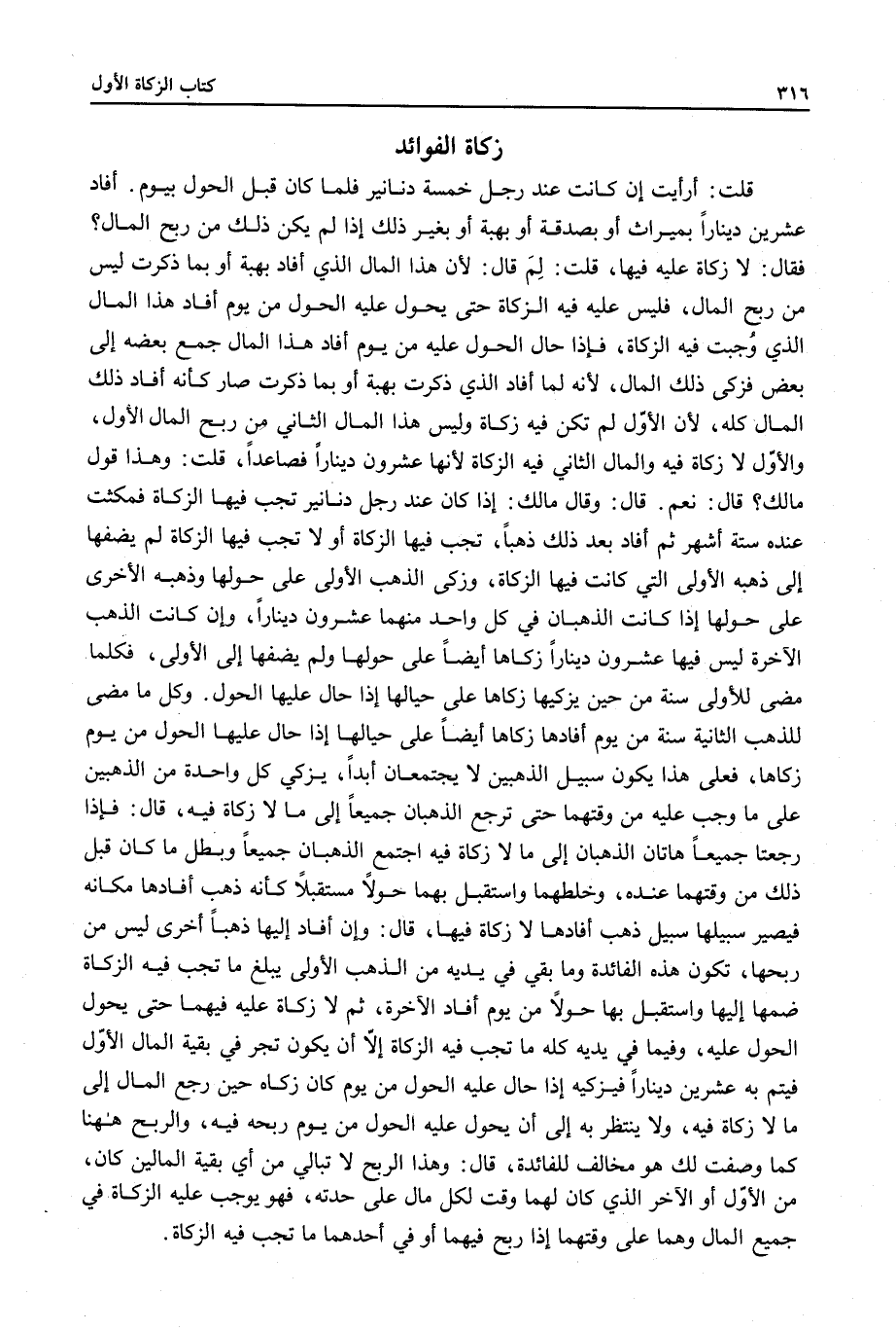 قُلْتُ: لِمَ قَالَ: لِأَنَّ هَذَا الْمَالَ الَّذِي أَفَادَ بِهِبَةٍ أَوْ بِمَا ذَكَرْتَ لَيْسَ مِنْ رِبْحِ الْمَالِ، فَلَيْسَ عَلَيْهِ فِيهِ الزَّكَاةُ حَتَّى يَحُولَ عَلَيْهِ الْحَوْلُ مِنْ يَوْمِ أَفَادَ هَذَا الْمَالَ الَّذِي وَجَبَتْ فِيهِ الزَّكَاةُ، فَإِذَا حَالَ الْحَوْلُ عَلَيْهِ مِنْ يَوْمِ أَفَادَ هَذَا الْمَالَ جَمَعَ بَعْضَهُ إلَى بَعْضٍ فَزَكَّى ذَلِكَ الْمَالَ، لِأَنَّهُ لَمَّا أَفَادَ الَّذِي ذَكَرْتَ بِهِبَةٍ أَوْ بِمَا ذَكَرْتَ صَارَ كَأَنَّهُ أَفَادَ ذَلِكَ الْمَالَ كُلَّهُ، لِأَنَّ الْأَوَّلَ لَمْ تَكُنْ فِيهِ زَكَاةٌ وَلَيْسَ هَذَا الْمَالُ الثَّانِي مِنْ رِبْحِ الْمَالِ الْأَوَّلِ، وَالْأَوَّلُ لَا زَكَاةَ فِيهِ وَالْمَالُ الثَّانِي فِيهِ الزَّكَاةُ لِأَنَّهَا عِشْرُونَ دِينَارًا فَصَاعِدًا.