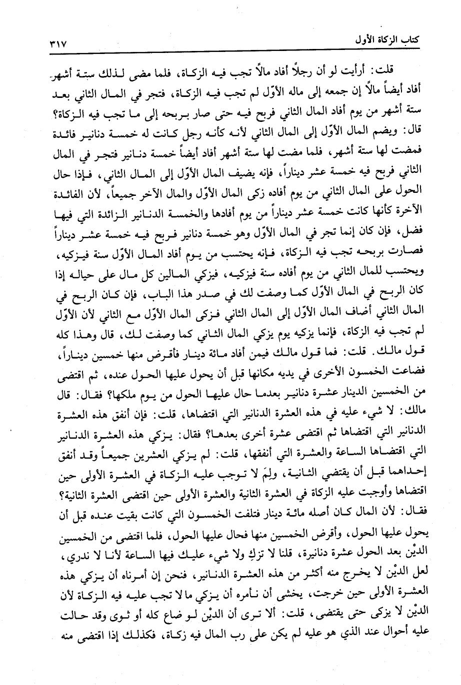 قُلْتُ: لِمَ يُزَكِّي الْعِشْرِينَ جَمِيعًا وَقَدْ أَنْفَقَ إحْدَاهُمَا قَبْلَ أَنْ يَقْتَضِيَ الثَّانِيَةَ، وَلِمَ لَا تُوجِبُ عَلَيْهِ الزَّكَاةَ فِي الْعَشَرَةِ الْأُولَى حِينَ اقْتَضَاهَا وَأَوْجَبْتَ عَلَيْهِ الزَّكَاةَ فِي الْعَشَرَةِ الثَّانِيَةِ وَالْعَشَرَةِ الْأُولَى حِينَ اقْتَضَى الْعَشَرَةَ الثَّانِيَةَ؟ فَقَالَ: لِأَنَّ الْمَالَ كَانَ أَصْلُهُ مِائَةَ دِينَارٍ فَتَلِفَتْ الْخَمْسُونَ الَّتِي كَانَتْ بَقِيَتْ عِنْدَهُ قَبْلَ أَنْ يَحُولَ عَلَيْهَا الْحَوْلُ، وَأَقْرَضَ الْخَمْسِينَ مِنْهَا فَحَالَ عَلَيْهَا الْحَوْلُ، فَلَمَّا اقْتَضَى مِنْ الْخَمْسِينَ الدَّيْنَ بَعْدَ الْحَوْلِ عَشَرَةَ دَنَانِيرَ، قُلْنَا لَا تُزَكِّ وَلَا شَيْءَ عَلَيْكَ فِيهَا السَّاعَةَ لِأَنَّا لَا نَدْرِي، لَعَلَّ الدَّيْنَ لَا يَخْرُجُ مِنْهُ أَكْثَرُ مِنْ هَذِهِ الْعَشَرَةِ الدَّنَانِيرِ، فَنَحْنُ إنْ أَمَرْنَاهُ أَنْ يُزَكِّيَ هَذِهِ الْعَشَرَةَ الْأُولَى حِينَ خَرَجَتْ، يُخْشَى أَنْ نَأْمُرَهُ أَنْ يُزَكِّيَ مَا لَا تَجِبُ عَلَيْهِ فِيهِ الزَّكَاةُ لِأَنَّ الدَّيْنَ لَا يُزَكَّى حَتَّى يُقْتَضَى.