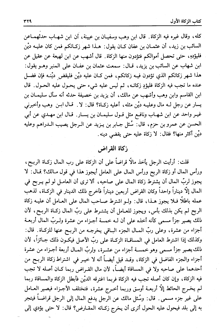 قَالَ أَشْهَبُ عَنْ ابْنِ لَهِيعَةَ عَنْ عُقَيْلٍ عَنْ ابْنِ شِهَابٍ عَنْ السَّائِبِ بْنِ يَزِيدَ، قَالَ: سَمِعْتُ عُثْمَانَ بْنَ عَفَّانَ عَلَى الْمِنْبَرِ وَهُوَ يَقُولُ: هَذَا شَهْرُ زَكَاتِكُمْ الَّذِي تُؤَدُّونَ فِيهِ زَكَاتَكُمْ، فَمَنْ كَانَ عَلَيْهِ دَيْنٌ فَلْيَقْضِ دَيْنَهُ فَإِنْ فَضَلَ عِنْدَهُ مَا تَجِبُ فِيهِ الزَّكَاةُ فَلْيُؤَدِّ زَكَاتَهُ، ثُمَّ لَيْسَ عَلَيْهِ شَيْءٌ حَتَّى يَحُولَ عَلَيْهِ الْحَوْلُ. قَالَ ابْنُ الْقَاسِمِ وَابْنُ وَهْبٍ وَأَشْهَبُ عَنْ مَالِكٍ: إنَّ يَزِيدَ بْنَ خُصَيْفَةَ حَدَّثَهُ أَنَّهُ سَأَلَ سُلَيْمَانَ بْنَ يَسَارٍ عَنْ رَجُلٍ لَهُ مَالٌ وَعَلَيْهِ دَيْنٌ مِثْلُهُ، أَعَلَيْهِ زَكَاةٌ؟ قَالَ: لَا. قَالَ ابْنُ وَهْبٍ وَأَخْبَرَنِي غَيْرُ وَاحِدٍ عَنْ ابْنِ شِهَابٍ وَنَافِعٍ مِثْلَ قَوْلِ سُلَيْمَانَ بْنِ يَسَارٍ قَالَ ابْنُ مَهْدِيٍّ عَنْ أَبِي الْحَسَنِ عَنْ عَمْرِو بْنِ حَزْمٍ، قَالَ: سُئِلَ جَابِرُ بْنُ يَزِيدَ عَنْ الرَّجُلِ يُصِيبُ الدَّرَاهِمَ وَعَلَيْهِ دَيْنٌ أَكْثَرُ مِنْهَا؟ فَقَالَ: لَا زَكَاةَ عَلَيْهِ حَتَّى يَقْضِيَ دَيْنَهُ.