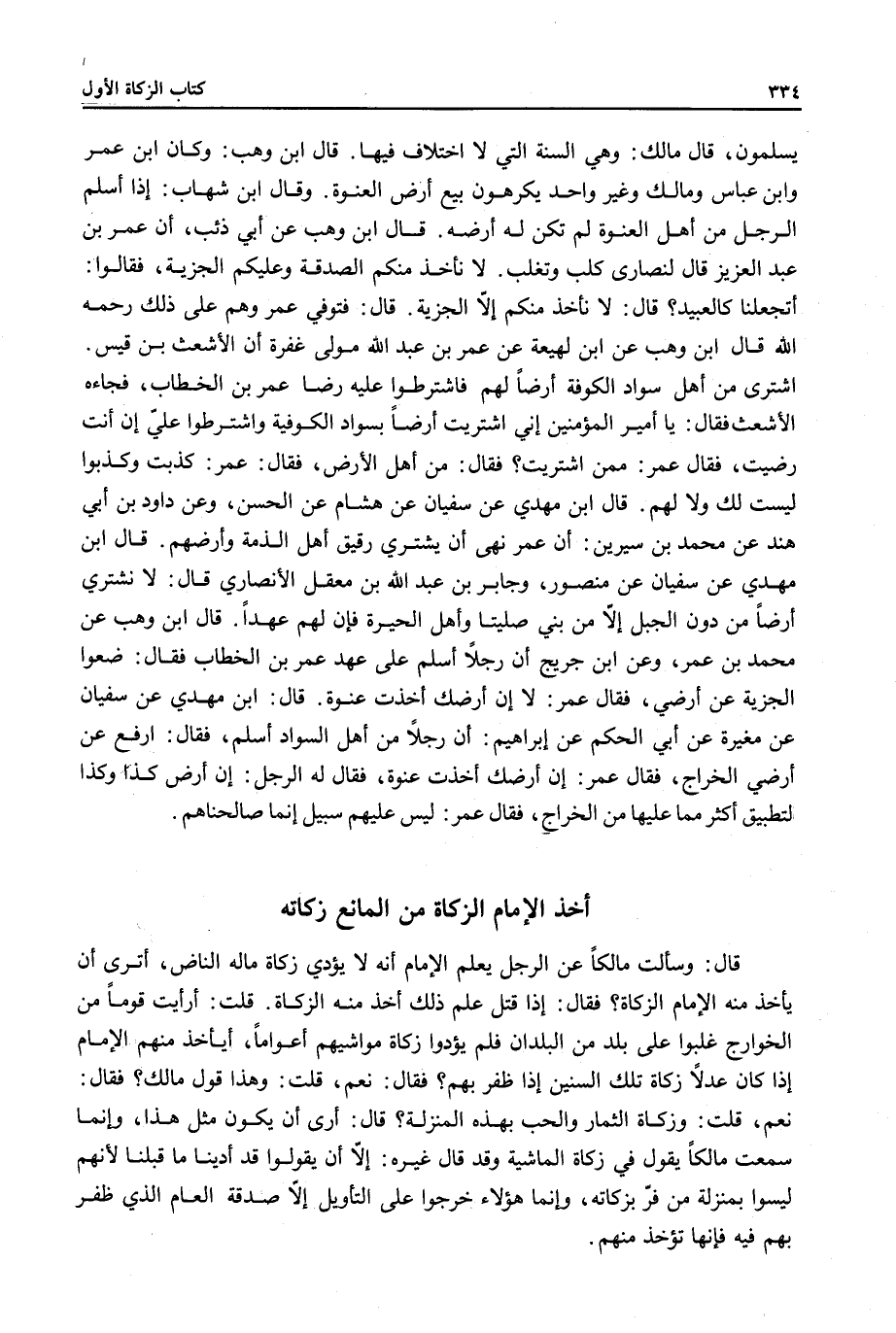 قَالَ ابْنُ وَهْبٍ: وَكَانَ ابْنُ عُمَرَ وَابْنُ عَبَّاسٍ وَمَالِكٌ وَغَيْرُ وَاحِدٍ يَكْرَهُونَ بَيْعَ أَرْضِ الْعَنْوَةِ. وَقَالَ ابْنُ شِهَابٍ: إذَا أَسْلَمَ الرَّجُلُ مِنْ أَهْلِ الْعَنْوَةِ لَمْ تَكُنْ لَهُ أَرْضُهُ. قَالَ ابْنُ وَهْبٍ عَنْ أَبِي ذِئْبٍ، أَنَّ عُمَرَ بْنَ عَبْدِ الْعَزِيزِ قَالَ لِنَصَارَى كَلْبٍ وَتَغْلِبَ. لَا نَأْخُذُ مِنْكُمْ الصَّدَقَةَ وَعَلَيْكُمْ الْجِزْيَةُ، فَقَالُوا: أَتَجْعَلُنَا كَالْعَبِيدِ؟ قَالَ: لَا نَأْخُذُ مِنْكُمْ إلَّا الْجِزْيَةَ. قَالَ: فَتُوُفِّيَ عُمَرُ وَهُمْ عَلَى ذَلِكَ - رَحِمَهُ اللَّهُ - قَالَ ابْنُ وَهْبٍ عَنْ ابْنِ لَهِيعَةَ عَنْ عُمَرَ بْنَ عَبْدِ اللَّهِ مَوْلَى غُفْرَةَ إنَّ الْأَشْعَثَ بْنَ قَيْسٍ اشْتَرَى مِنْ أَهْلِ سَوَادِ الْكُوفَةِ أَرْضًا لَهُمْ فَاشْتَرَطُوا عَلَيْهِ رِضَا عُمَرَ بْنِ الْخَطَّابِ، فَجَاءَهُ الْأَشْعَثُ فَقَالَ: يَا أَمِيرَ الْمُؤْمِنِينَ إنِّي اشْتَرَيْتُ أَرْضًا بِسَوَادِ الْكُوفَةِ وَاشْتَرَطُوا عَلَيَّ إنْ أَنْتَ رَضِيَتْ، فَقَالَ عُمَرُ: مِمَّنْ اشْتَرَيْتَ؟ فَقَالَ: مِنْ أَهْلِ الْأَرْضِ، فَقَالَ: عُمَرُ: كَذَبْتَ وَكَذَبُوا لَيْسَتْ لَكَ وَلَا لَهُمْ.