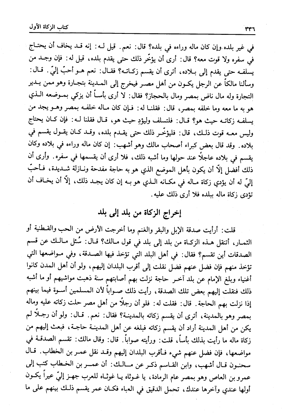 قَالَ: سُئِلَ مَالِكٌ عَنْ، قَسْمِ الصَّدَقَاتِ أَيْنَ تُقَسَّمُ؟ فَقَالَ: فِي أَهْلِ الْبَلَدِ الَّتِي تُؤْخَذُ فِيهَا الصَّدَقَةُ، وَفِي مَوَاضِعِهَا الَّتِي تُؤْخَذُ مِنْهُمْ فَإِنْ فَضَلَ عَنْهُمْ فَضْلٌ نُقِلَتْ إلَى أَقْرَبِ الْبُلْدَانِ إلَيْهِمْ، وَلَوْ أَنَّ أَهْلَ الْمُدُنِ كَانُوا أَغْنِيَاءَ وَبَلَغَ الْإِمَامَ عَنْ بَلَدٍ آخَرَ حَاجَةٌ نَزَلَتْ بِهِمْ أَصَابَتْهُمْ سَنَةٌ أَذْهَبَتْ مَوَاشِيَهُمْ أَوْ مَا أَشْبَهَ ذَلِكَ فَنُقِلَتْ إلَيْهِمْ بَعْضُ تِلْكَ الصَّدَقَةِ، رَأَيْتَ ذَلِكَ صَوَابًا لِأَنَّ الْمُسْلِمِينَ أُسْوَةٌ فِيمَا بَيْنَهُمْ إذَا نَزَلَتْ بِهِمْ الْحَاجَةُ.