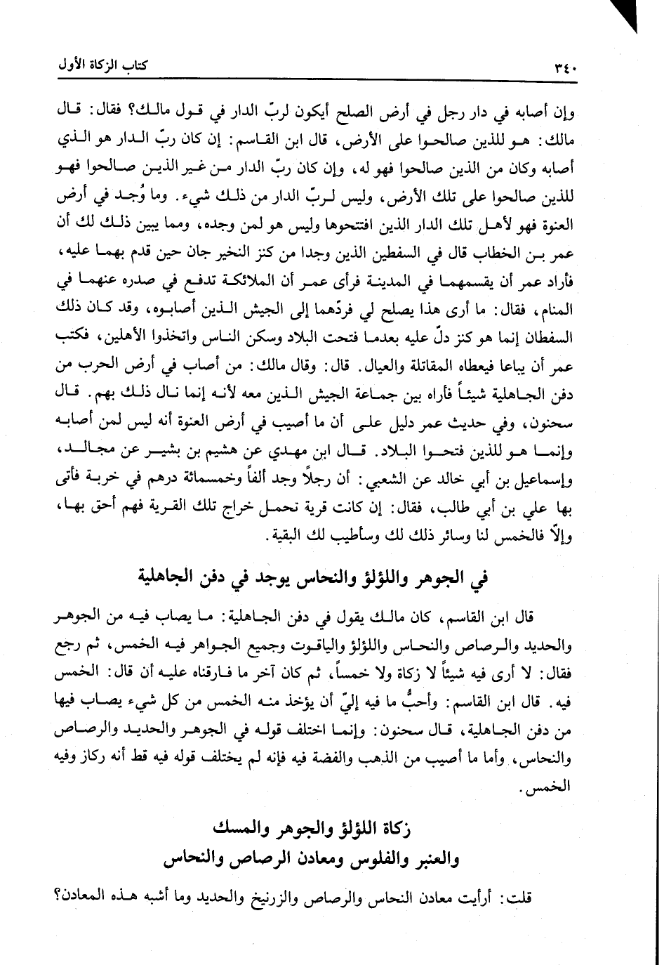 فِي الْجَوْهَرِ وَاللُّؤْلُؤِ وَالنُّحَاسِ يُوجَدُ فِي دَفْنِ الْجَاهِلِيَّةِ قَالَ ابْنُ الْقَاسِمِ، كَانَ مَالِكٌ يَقُولُ فِي دَفْنِ الْجَاهِلِيَّةِ: مَا يُصَابُ فِيهِ مِنْ الْجَوْهَرِ وَالْحَدِيدِ وَالرَّصَاصِ وَالنُّحَاسِ وَاللُّؤْلُؤِ وَالْيَاقُوتِ وَجَمِيعِ الْجَوَاهِرِ فِيهِ الْخُمْسُ، ثُمَّ رَجَعَ فَقَالَ: لَا أَرَى فِيهِ شَيْئًا لَا زَكَاةً وَلَا خُمْسًا، ثُمَّ كَانَ آخَرُ مَا فَارَقْنَاهُ عَلَيْهِ أَنْ قَالَ: الْخُمْسُ فِيهِ.