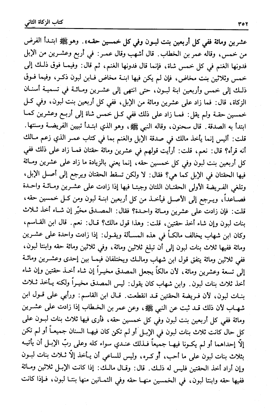 قَالَ ابْنُ الْقَاسِمِ، وَكَانَ ابْنُ شِهَابٍ يُخَالِفُ مَالِكًا فِي هَذِهِ الْمَسْأَلَةِ وَيَقُولُ: إذَا زَادَتْ وَاحِدَةٌ عَلَى عِشْرِينَ وَمِائَةٍ فَفِيهَا ثَلَاثُ بَنَاتِ لَبُونٍ إلَى أَنْ تَبْلُغَ ثَلَاثِينَ وَمِائَةً، وَفِي ثَلَاثِينَ وَمِائَةٍ: حِقَّةٌ وَابْنَتَا لَبُونٍ، فَفِي ثَلَاثِينَ وَمِائَةٍ يَتَّفِقُ قَوْلُ ابْنِ شِهَابٍ وَمَالِكٍ وَيَخْتَلِفَانِ فِيمَا بَيْنَ إحْدَى وَعِشْرِينَ وَمِائَةٍ إلَى تِسْعَةٍ وَعِشْرِينَ وَمِائَةٍ، لِأَنَّ مَالِكًا يَجْعَلُ الْمُصَدِّقَ مُخَيَّرًا إنْ شَاءَ أَخَذَ حِقَّتَيْنِ وَإِنْ شَاءَ أَخَذَ ثَلَاثَ بَنَاتِ لَبُونٍ وَابْنُ شِهَابٍ كَانَ يَقُولُ: لَيْسَ الْمُصَدِّقُ مُخَيَّرًا وَلَكِنَّهُ يَأْخُذُ ثَلَاثَ بَنَاتِ لَبُونٍ، لِأَنَّ فَرِيضَةَ الْحِقَّتَيْنِ قَدْ انْقَطَعَتْ. قَالَ ابْنُ الْقَاسِمِ: وَرَأْيِي عَلَى قَوْلِ ابْنِ شِهَابٍ لِأَنَّ ذَلِكَ قَدْ ثَبَتَ عَنْ النَّبِيِّ - صَلَّى اللَّهُ عَلَيْهِ وَسَلَّمَ -، وَعَنْ عُمَرَ بْنِ الْخَطَّابِ إذَا زَادَتْ عَلَى عِشْرِينَ وَمِائَةٍ فَفِي كُلِّ أَرْبَعِينَ بِنْتُ لَبُونٍ وَفِي كُلِّ خَمْسِينَ حِقَّةٌ، فَأَرَى فِيهَا ثَلَاثَ بَنَاتِ لَبُونٍ عَلَى كُلِّ حَالٍ كَانَتْ ثَلَاثُ بَنَاتِ لَبُونٍ فِي الْإِبِلِ أَوْ لَمْ تَكُنْ كَانَ فِيهَا السِّنَانُ جَمِيعًا أَوْ لَمْ تَكُنْ إلَّا إحْدَاهُمَا أَوْ لَمْ يَكُونَا فِيهَا جَمِيعًا فَذَلِكَ عِنْدِي سَوَاءٌ كُلُّهُ وَعَلَى رَبِّ الْإِبِلِ أَنْ يَأْتِيَهُ بِثَلَاثِ بَنَاتِ لَبُونٍ عَلَى مَا أَحَبَّ، أَوْ كَرِهَ، وَلَيْسَ لِلسَّاعِي أَنْ يَأْخُذَ إلَّا ثَلَاثَ بَنَاتِ لَبُونٍ وَإِنْ أَرَادَ أَخْذَ الْحِقَّتَيْنِ فَلَيْسَ لَهُ ذَلِكَ.