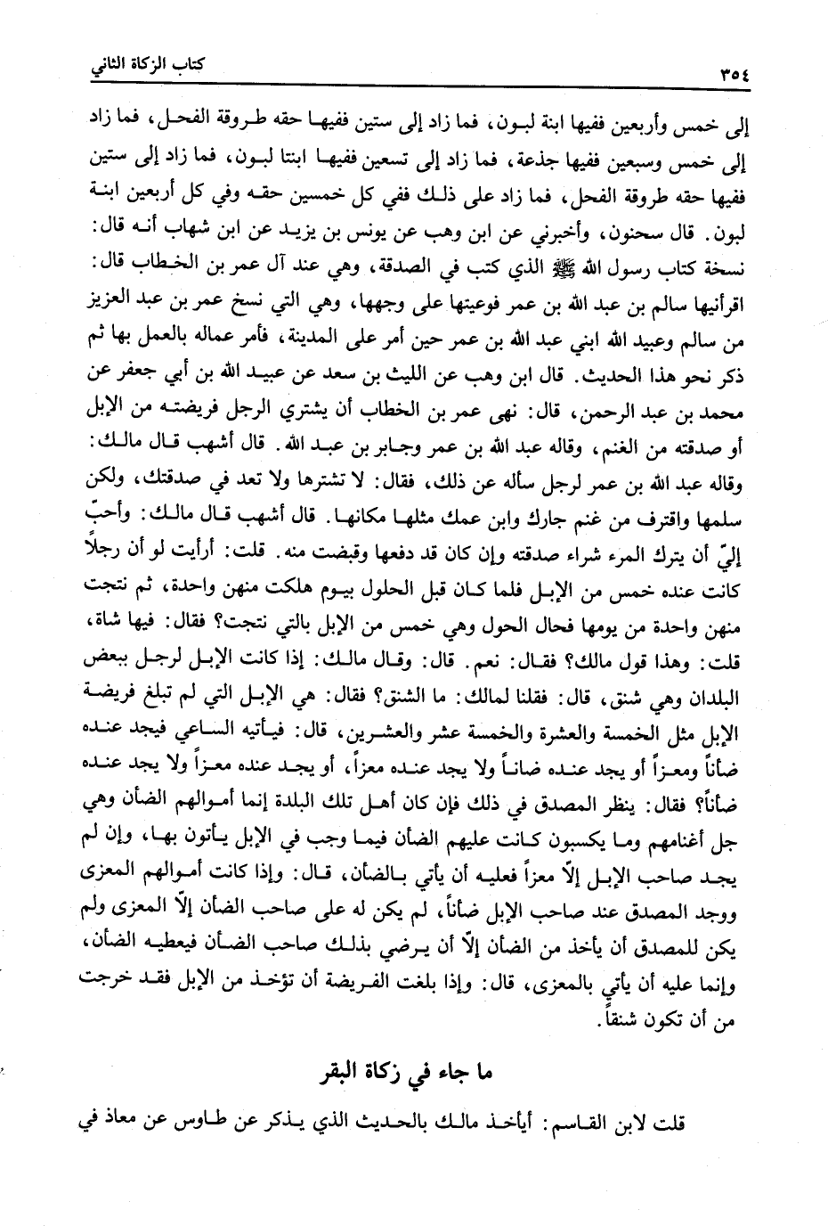 مَا جَاءَ فِي زَكَاةِ الْبَقَرِ قُلْتُ لِابْنِ الْقَاسِمِ: أَيَأْخُذُ مَالِكٌ بِالْحَدِيثِ الَّذِي يُذْكَرُ عَنْ طَاوُسٍ عَنْ مُعَاذٍ فِي