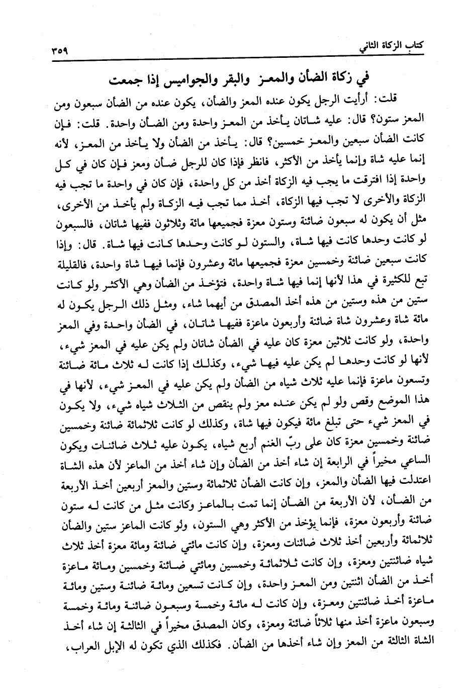فِي زَكَاةِ الضَّأْنِ وَالْمَعْزِ وَالْبَقَرِ وَالْجَوَامِيسِ إذَا جُمِعَتْ قُلْتُ: أَرَأَيْتَ الرَّجُلَ يَكُونُ عِنْدَهُ الْمَعْزُ وَالضَّأْنُ، يَكُونُ عِنْدَهُ مِنْ الضَّأْنِ سَبْعُونَ وَمِنْ الْمَعْزِ سِتُّونَ؟