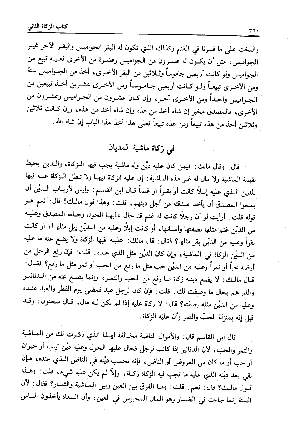 قُلْتُ: أَرَأَيْتَ لَوْ أَنَّ رَجُلًا كَانَتْ لَهُ غَنَمٌ قَدْ حَالَ عَلَيْهَا الْحَوْلُ وَجَاءَهُ الْمُصَدِّقُ وَعَلَيْهِ مَنْ الدَّيْنِ غَنَمٌ مِثْلُهَا بِصِفَتِهَا وَأَسْنَانِهَا، أَوْ كَانَتْ إبِلًا وَعَلَيْهِ مَنْ الدَّيْنِ إبِلٌ مِثْلُهَا، أَوْ كَانَتْ بَقَرًا وَعَلَيْهِ مَنْ الدَّيْنِ بَقَرٌ مِثْلُهَا؟ فَقَالَ: قَالَ مَالِكٌ: عَلَيْهِ فِيهَا الزَّكَاةُ وَلَا يَضَعُ عَنْهُ مَا عَلَيْهِ مِنْ الدَّيْنِ الزَّكَاةَ فِي الْمَاشِيَةِ، وَإِنْ كَانَ الدَّيْنُ مِثْلَ الَّذِي عِنْدَهُ.