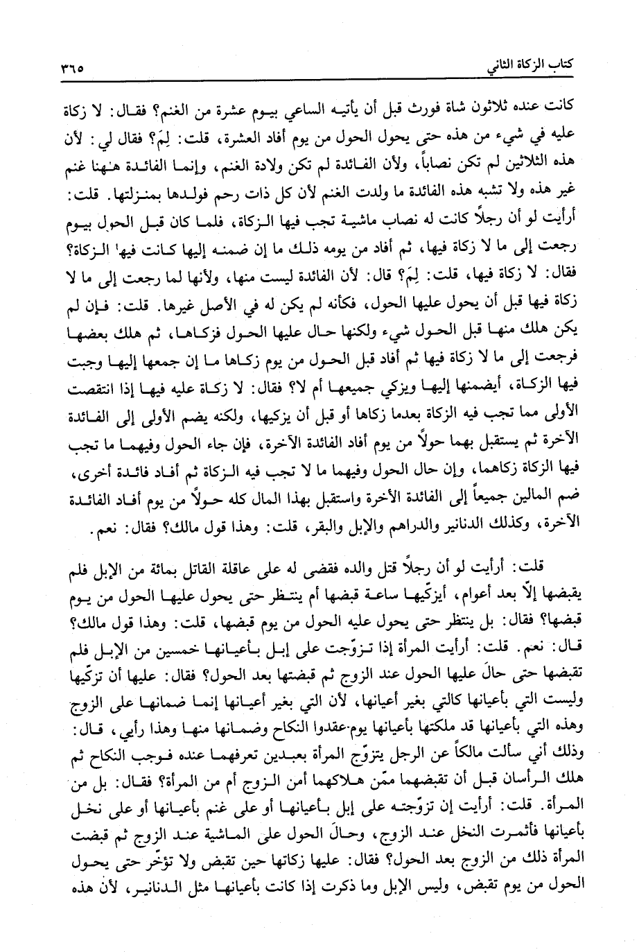 قُلْتُ: فَإِنْ لَمْ يَكُنْ هَلَكَ مِنْهَا قَبْلَ الْحَوْلِ شَيْءٌ وَلَكِنَّهَا حَالَ عَلَيْهَا الْحَوْلُ فَزَكَّاهَا، ثُمَّ هَلَكَ بَعْضُهَا فَرَجَعَتْ إلَى مَا لَا زَكَاةَ فِيهَا ثُمَّ أَفَادَ قَبْلَ الْحَوْلُ مِنْ يَوْمِ زَكَّاهَا مَا إنْ جَمَعَهَا إلَيْهَا وَجَبَتْ فِيهَا الزَّكَاةُ، أَيَضْمَنُهَا إلَيْهَا وَيُزَكِّي جَمِيعَهَا أَمْ لَا؟ فَقَالَ: لَا زَكَاةَ عَلَيْهِ فِيهَا إذَا انْتَقَصَتْ الْأُولَى مِمَّا تَجِبُ فِيهِ الزَّكَاةُ بَعْدَمَا زَكَّاهَا أَوْ قَبْلَ أَنْ يُزَكِّيَهَا، وَلَكِنَّهُ يَضُمُّ الْأُولَى إلَى الْفَائِدَةِ الْآخِرَةِ ثُمَّ يَسْتَقْبِلُ بِهِمَا حَوْلًا مِنْ يَوْمِ أَفَادَ الْفَائِدَةَ الْآخِرَةَ، فَإِنْ جَاءَ الْحَوْلُ وَفِيهِمَا مَا تَجِبُ فِيهَا الزَّكَاةُ زَكَّاهُمَا، وَإِنْ حَالَ الْحَوْلُ وَفِيهِمَا مَا لَا تَجِبُ فِيهِ الزَّكَاةُ ثُمَّ أَفَادَ فَائِدَةً أُخْرَى، ضَمّ الْمَالَيْنِ جَمِيعًا إلَى الْفَائِدَةِ الْآخِرَةِ وَاسْتَقْبَلَ بِهَذَا الْمَالِ كُلَّهُ حَوْلًا مِنْ يَوْمِ أَفَادَ الْفَائِدَةَ الْآخِرَةَ، وَكَذَلِكَ الدَّنَانِيرُ وَالدَّرَاهِمُ وَالْإِبِلُ وَالْبَقَرُ.
