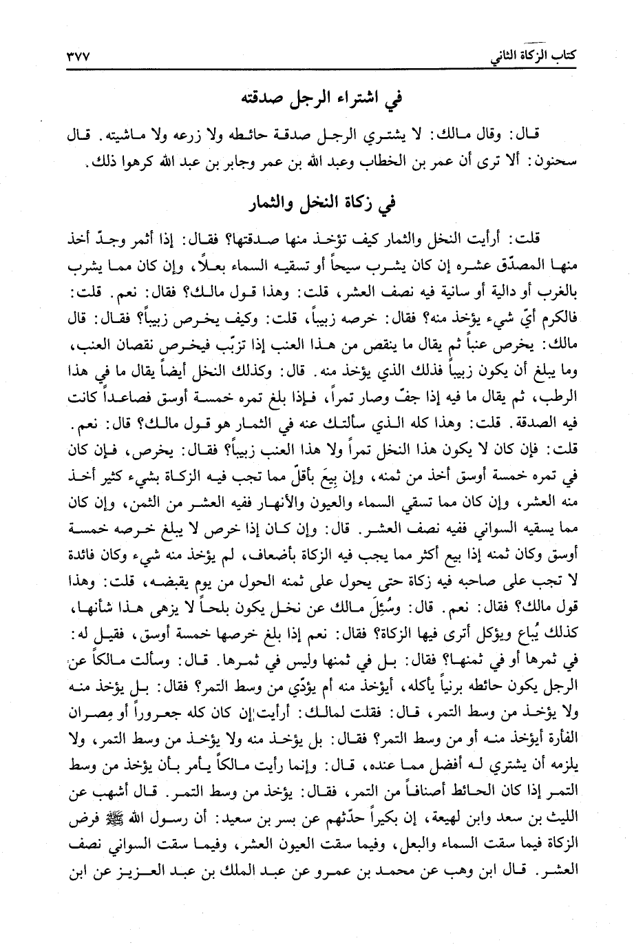 قَالَ: وَكَذَلِكَ النَّخْلُ أَيْضًا يُقَالُ مَا فِي هَذَا الرُّطَبِ، ثُمَّ يُقَالُ مَا فِيهِ إذَا جَفَّ وَصَارَ تَمْرًا، فَإِذَا بَلَغَ تَمْرُهُ خَمْسَةَ أَوْسُقٍ فَصَاعِدًا كَانَتْ فِيهِ الصَّدَقَةُ. قُلْتُ: وَهَذَا كُلُّهُ الَّذِي سَأَلْتُكَ عَنْهُ فِي الثِّمَارِ هُوَ قَوْلُ مَالِكٍ؟