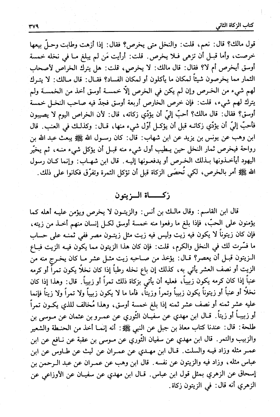 ِ قَالَ ابْنُ الْقَاسِمِ: وَقَالَ مَالِكُ بْنُ أَنَسٍ: وَالزَّيْتُونُ لَا يُخْرَصُ وَيُؤَمَّنُ عَلَيْهِ أَهْلُهُ كَمَا يُؤَمَّنُونَ عَلَى الْحَبِّ، فَإِذَا بَلَغَ مَا رَفَعُوا مِنْهُ خَمْسَةَ أَوْسُقٍ لِكُلِّ إنْسَانٍ مِنْهُمْ أُخِذَ مِنْ زَيْتِهِ، فَإِنْ كَانَ زَيْتُونًا لَا يَكُونُ فِيهِ زَيْتٌ وَلَيْسَ فِيهِ زَيْتٌ مِثْلَ زَيْتُونِ مِصْرَ فَفِي ثَمَنِهِ عَلَى حِسَابِ مَا فَسَرَّتْ لَكَ فِي النَّخْلِ وَالْكَرْمِ.