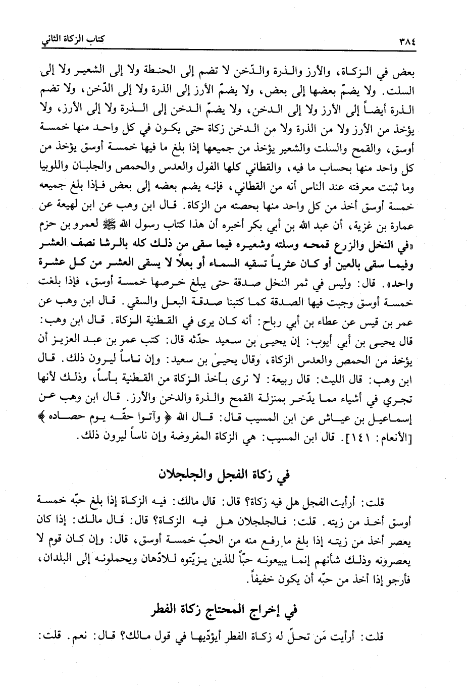 ِ قُلْتُ: أَرَأَيْتَ الْفُجْلَ هَلْ فِيهِ زَكَاةٌ؟ قَالَ: قَالَ مَالِكٌ: فِيهِ الزَّكَاةُ إذَا بَلَغَ حَبُّهُ خَمْسَةَ أَوْسُقٍ أُخِذَ مِنْ زَيْتِهِ.