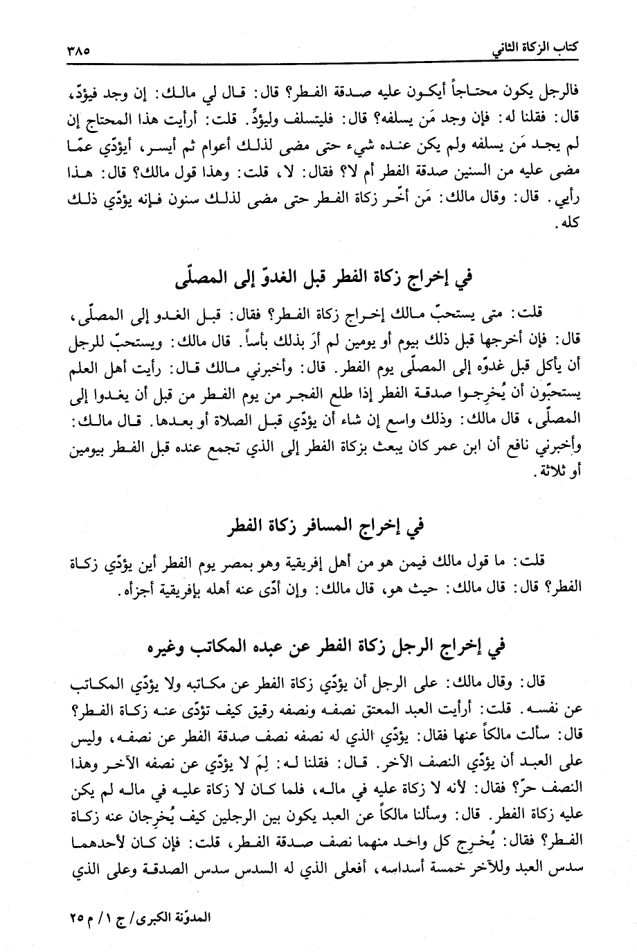 فِي إخْرَاجِ زَكَاةِ الْفِطْرِ قَبْلَ الْغَدْوِ إلَى الْمُصَلَّى قُلْتُ: مَتَى يَسْتَحِبُّ مَالِكٌ إخْرَاجَ زَكَاةِ الْفِطْرِ؟ فَقَالَ: قَبْلَ الْغُدُوِّ إلَى الْمُصَلَّيْ، قَالَ: فَإِنْ أَخْرَجَهَا قَبْلَ ذَلِكَ بِيَوْمٍ أَوْ يَوْمَيْنِ لَمْ أَرَ بِذَلِكَ بَأْسًا. قَالَ مَالِكٌ: وَيُسْتَحَبُّ لِلرَّجُلِ أَنْ يَأْكُلَ قَبْلَ غُدُوِّهِ إلَى الْمُصَلَّى يَوْمَ الْفِطْرِ.