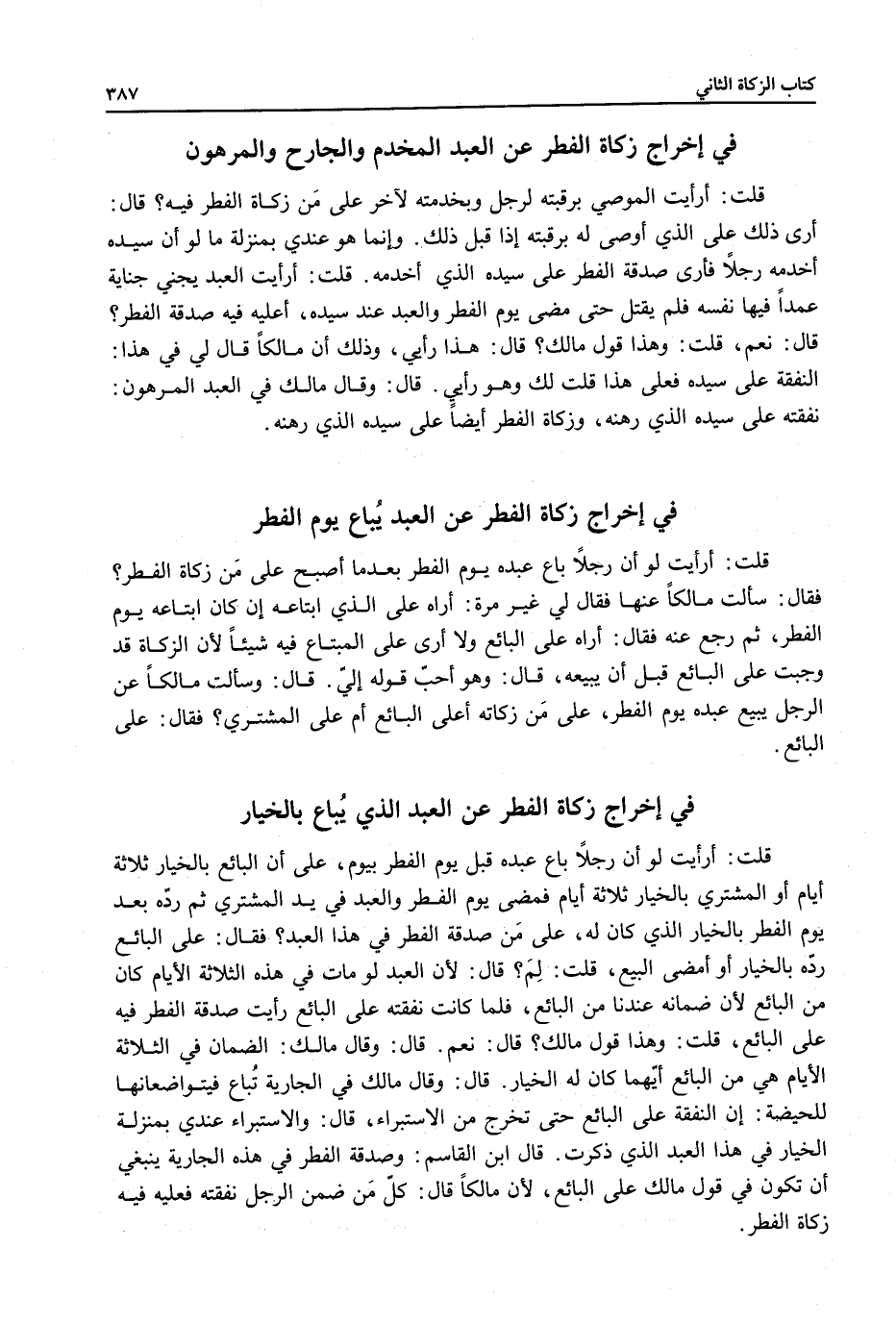 ِ قُلْتُ: أَرَأَيْتَ لَوْ أَنَّ رَجُلًا بَاعَ عَبْدَهُ يَوْمَ الْفِطْرِ بَعْدَمَا أَصْبَحَ عَلَى مَنْ زَكَاةُ الْفِطْرِ؟ فَقَالَ: سَأَلْتُ مَالِكًا عَنْهَا فَقَالَ لِي غَيْرَ مَرَّةٍ: أَرَاهُ عَلَى الَّذِي ابْتَاعَهُ إنْ كَانَ ابْتَاعَهُ يَوْمَ الْفِطْرِ، ثُمَّ رَجَعَ عَنْهُ فَقَالَ: أَرَاهُ عَلَى الْبَائِعِ وَلَا أَرَى عَلَى الْمُبْتَاعِ فِيهِ شَيْئًا لِأَنَّ الزَّكَاةَ قَدْ وَجَبَتْ عَلَى الْبَائِعِ قَبْلَ أَنْ يَبِيعَهُ، قَالَ: وَهُوَ أَحَبُّ قَوْلِهِ إلَيَّ.