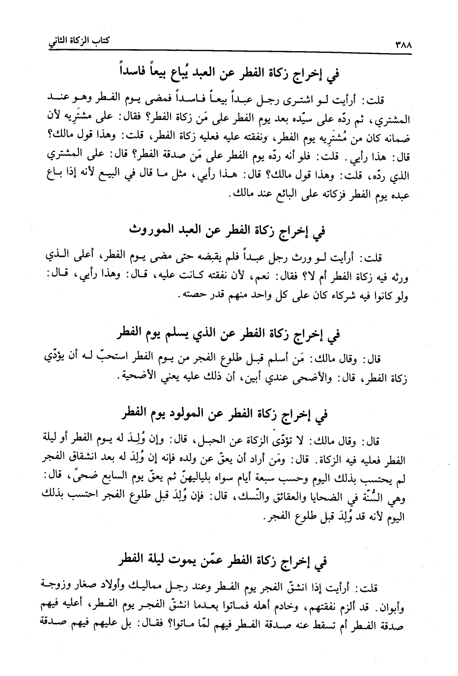 قُلْتُ: أَرَأَيْتَ لَوْ اشْتَرَى رَجُلٌ عَبْدًا بَيْعًا فَاسِدًا فَمَضَى يَوْمُ الْفِطْرِ وَهُوَ عِنْدَ الْمُشْتَرِي، ثُمَّ رَدَّهُ عَلَى سَيِّدِهِ بَعْدَ يَوْمِ الْفِطْرِ عَلَى مَنْ زَكَاةُ الْفِطْرِ؟ فَقَالَ: عَلَى مُشْتَرِيهِ لِأَنَّ ضَمَانَهُ كَانَ مِنْ مُشْتَرِيهِ يَوْمَ الْفِطْرِ، وَنَفَقَتُهُ عَلَيْهِ فَعَلَيْهِ زَكَاةُ الْفِطْرِ.