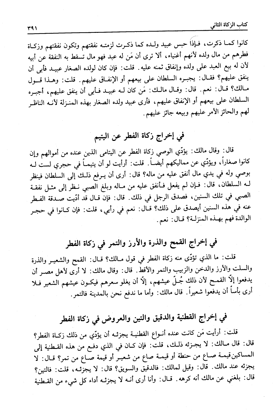 ِ قُلْتُ: أَرَأَيْتَ مَنْ كَانَتْ عِنْدَهُ أَنْوَاعُ الْقُطْنِيَّةِ يُجْزِئُهُ أَنْ يُؤَدِّيَ مِنْ ذَلِكَ زَكَاةَ الْفِطْرِ؟ قَالَ: قَالَ مَالِكٌ: لَا يُجْزِئُهُ ذَلِكَ.
