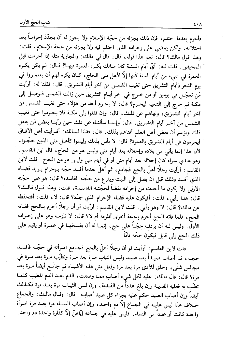 قُلْتُ لِابْنِ الْقَاسِمِ: أَرَأَيْتَ لَوْ أَنَّ رَجُلًا أَهَلَّ بِالْحَجِّ فَجَامَعَ امْرَأَتَهُ فِي حَجِّهِ فَأَفْسَدَ حَجَّهُ، ثُمَّ أَصَابَ صَيْدًا بَعْدَ صَيْدٍ وَلَبِسَ الثِّيَابَ مَرَّةً بَعْدَ مَرَّةٍ وَتَطَيَّبَ مَرَّةً بَعْدَ مَرَّةٍ فِي مَجَالِسَ شَتَّى، وَحَلَقَ لِلْأَذَى مَرَّةً بَعْدَ مَرَّةٍ وَفَعَلَ مِثْلَ هَذِهِ الْأَشْيَاءِ ثُمَّ جَامَعَ أَيْضًا مَرَّةً بَعْدَ مَرَّةٍ؟