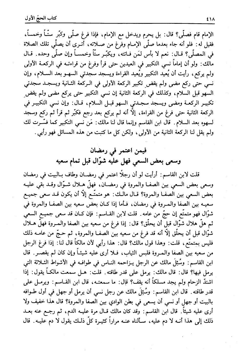 قُلْت لِابْنِ الْقَاسِمِ: أَرَأَيْت لَوْ أَنَّ رَجُلًا اعْتَمَرَ فِي رَمَضَانَ وَطَافَ بِالْبَيْتِ فِي رَمَضَانَ وَسَعَى بَعْضَ السَّعْيِ بَيْنَ الصَّفَا وَالْمَرْوَةِ فِي رَمَضَانَ، فَهَلَّ هِلَالُ شَوَّالٍ وَقَدْ بَقِيَ عَلَيْهِ بَعْضُ السَّعْيِ بَيْنَ الصَّفَا وَالْمَرْوَةِ؟