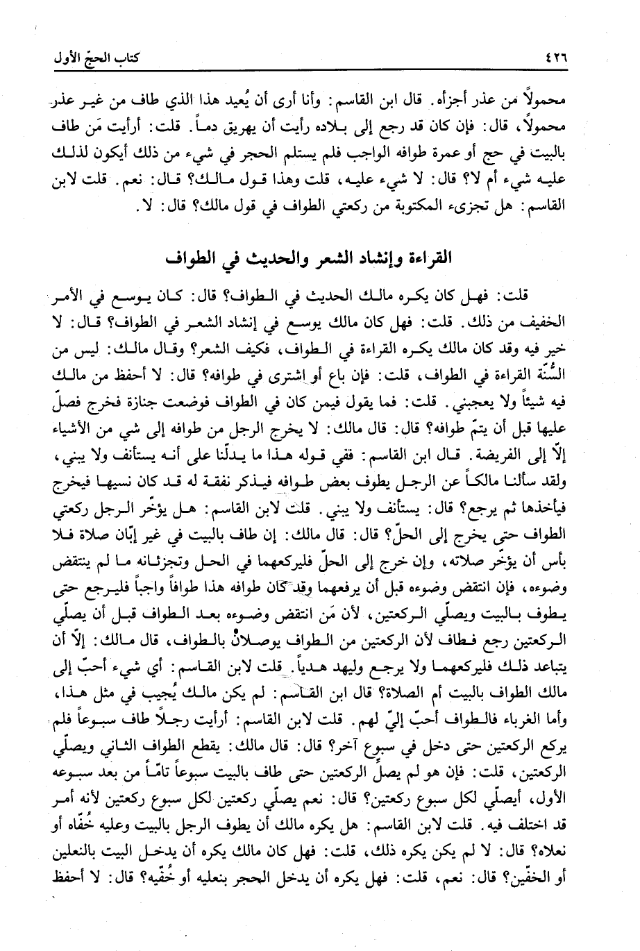 قَالَ: كَانَ يُوَسِّعُ فِي الْأَمْرِ الْخَفِيفِ مِنْ ذَلِكَ. قُلْت: فَهَلْ كَانَ مَالِكٌ يُوَسِّعُ فِي إنْشَادِ الشِّعْرِ فِي الطَّوَافِ؟
