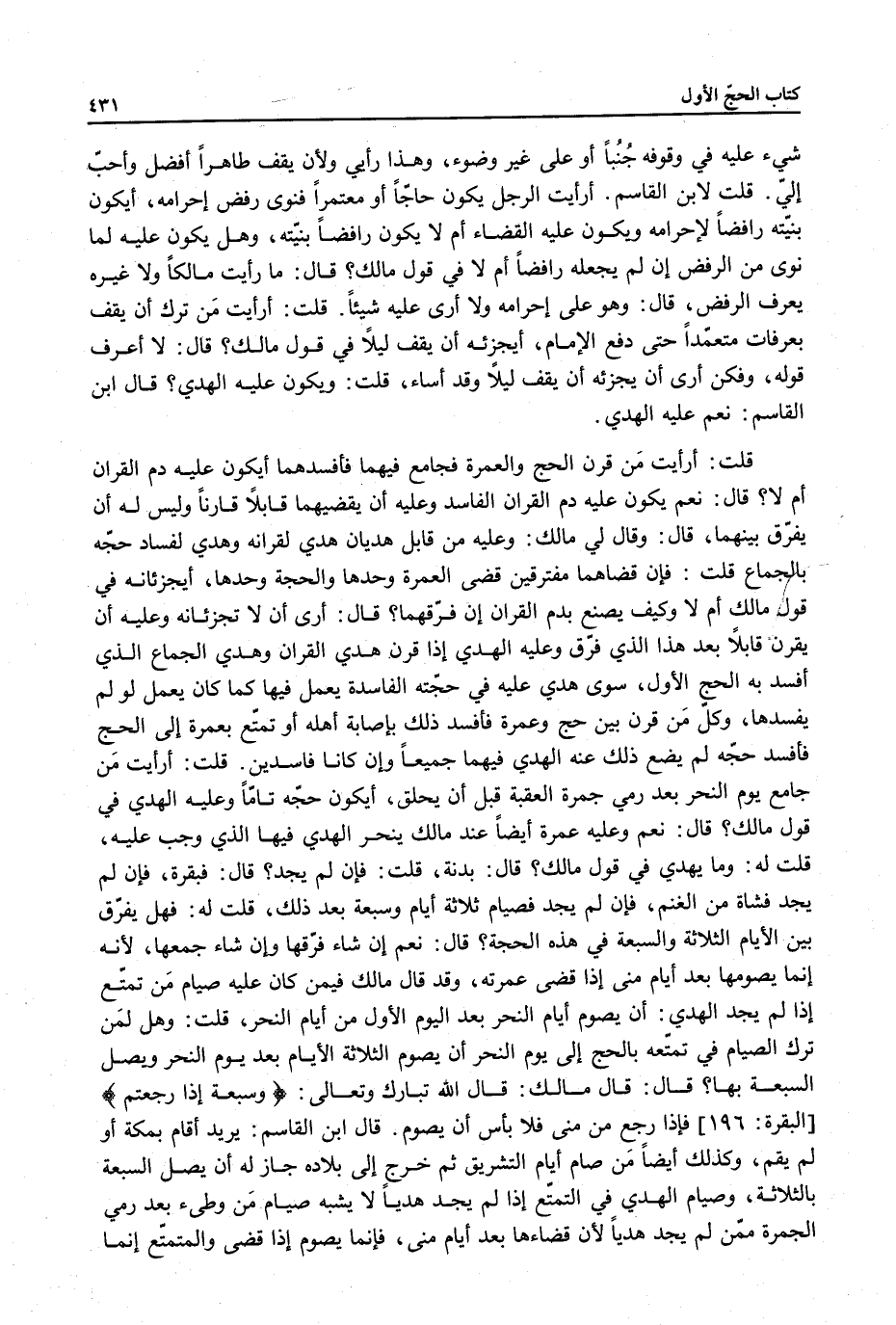 قُلْت لِابْنِ الْقَاسِمِ. أَرَأَيْت الرَّجُلَ يَكُونُ حَاجًّا أَوْ مُعْتَمِرًا فَنَوَى رَفْضَ إحْرَامِهِ، أَيَكُونُ بِنِيَّتِهِ رَافِضًا لِإِحْرَامِهِ وَيَكُونُ عَلَيْهِ الْقَضَاءُ أَمْ لَا يَكُونُ رَافِضًا بِنِيَّتِهِ، وَهَلْ يَكُونُ عَلَيْهِ لِمَا نَوَى مِنْ الرَّفْضِ إنْ لَمْ يَجْعَلْهُ رَافِضًا أَمْ لَا فِي قَوْلِ مَالِكٍ؟