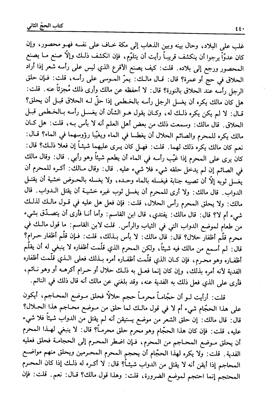 قَالَ: قَالَ مَالِكٌ: إنْ حَلَقَ الشَّعْرَ مِنْ مَوْضِعٍ يَسْتَيْقِنُ أَنَّهُ لَمْ يَقْتُلْ مِنْ الدَّوَابِّ شَيْئًا فَلَا شَيْءَ عَلَيْهِ، قُلْت: فَإِنْ كَانَ هَذَا الْحَجَّامُ وَهُوَ مُحْرِمٌ حَلَقَ مُحْرِمًا؟