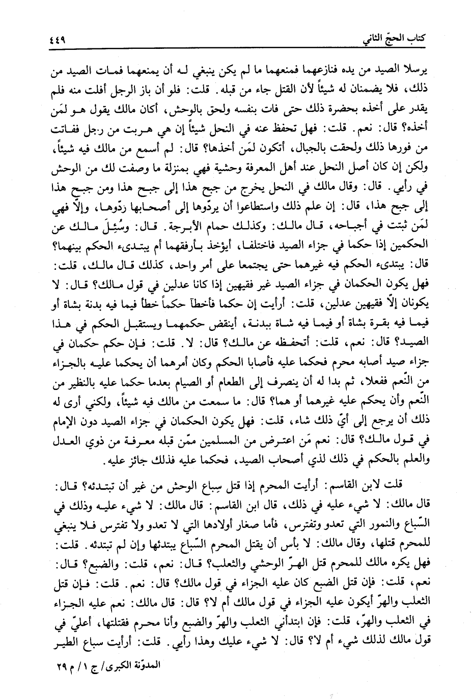 قَالَ: قَالَ مَالِكٌ: لَا شَيْءَ عَلَيْهِ فِي ذَلِكَ، قَالَ ابْنُ الْقَاسِمِ: قَالَ مَالِكٌ: لَا شَيْءَ عَلَيْهِ وَذَلِكَ فِي السِّبَاعِ وَالنُّمُورِ الَّتِي تَعْدُو وَتَفْتَرِسُ، فَأَمَّا صِغَارُ أَوْلَادِهَا الَّتِي لَا تَعْدُو وَلَا تَفْتَرِسُ فَلَا يَنْبَغِي لِلْمُحْرِمِ قَتْلُهَا، وَقَالَ مَالِكٌ: لَا بَأْسَ أَنْ يَقْتُلَ الْمُحْرِمُ السِّبَاعَ يَبْتَدِئُهَا وَإِنْ لَمْ تَبْتَدِئْهُ.