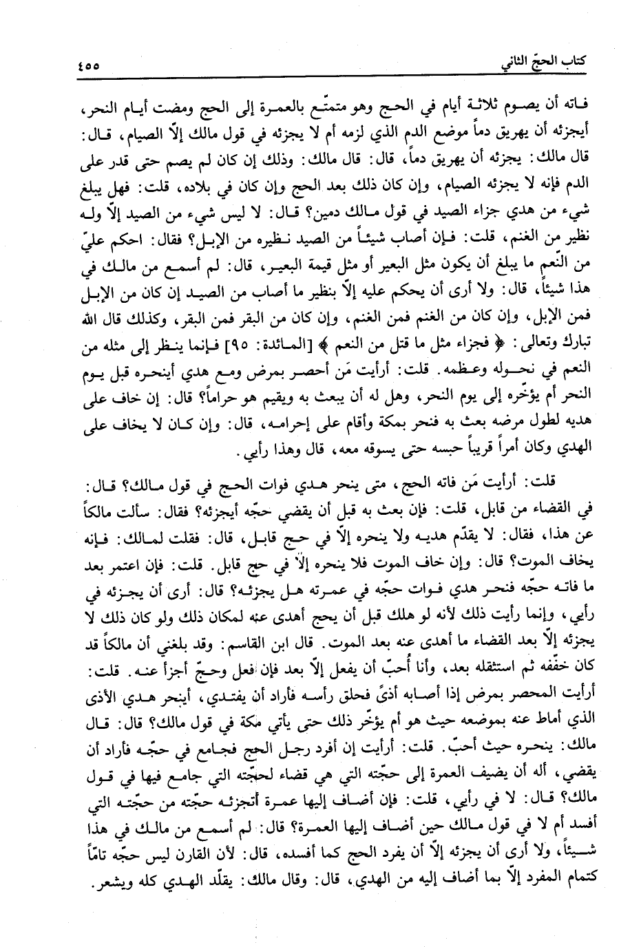 قَالَ: فِي الْقَضَاءِ مِنْ قَابِلٍ، قُلْت: فَإِنْ بَعَثَ بِهِ قَبْلَ أَنْ يَقْضِيَ حَجَّهُ أَيُجْزِئُهُ؟ فَقَالَ: سَأَلْت مَالِكًا عَنْ هَذَا، فَقَالَ: لَا يُقَدِّمُ هَدْيَهُ وَلَا يَنْحَرُهُ إلَّا فِي حَجٍّ قَابِلٍ، قَالَ: فَقُلْت لِمَالِكٍ: فَإِنَّهُ يَخَافُ الْمَوْتَ؟