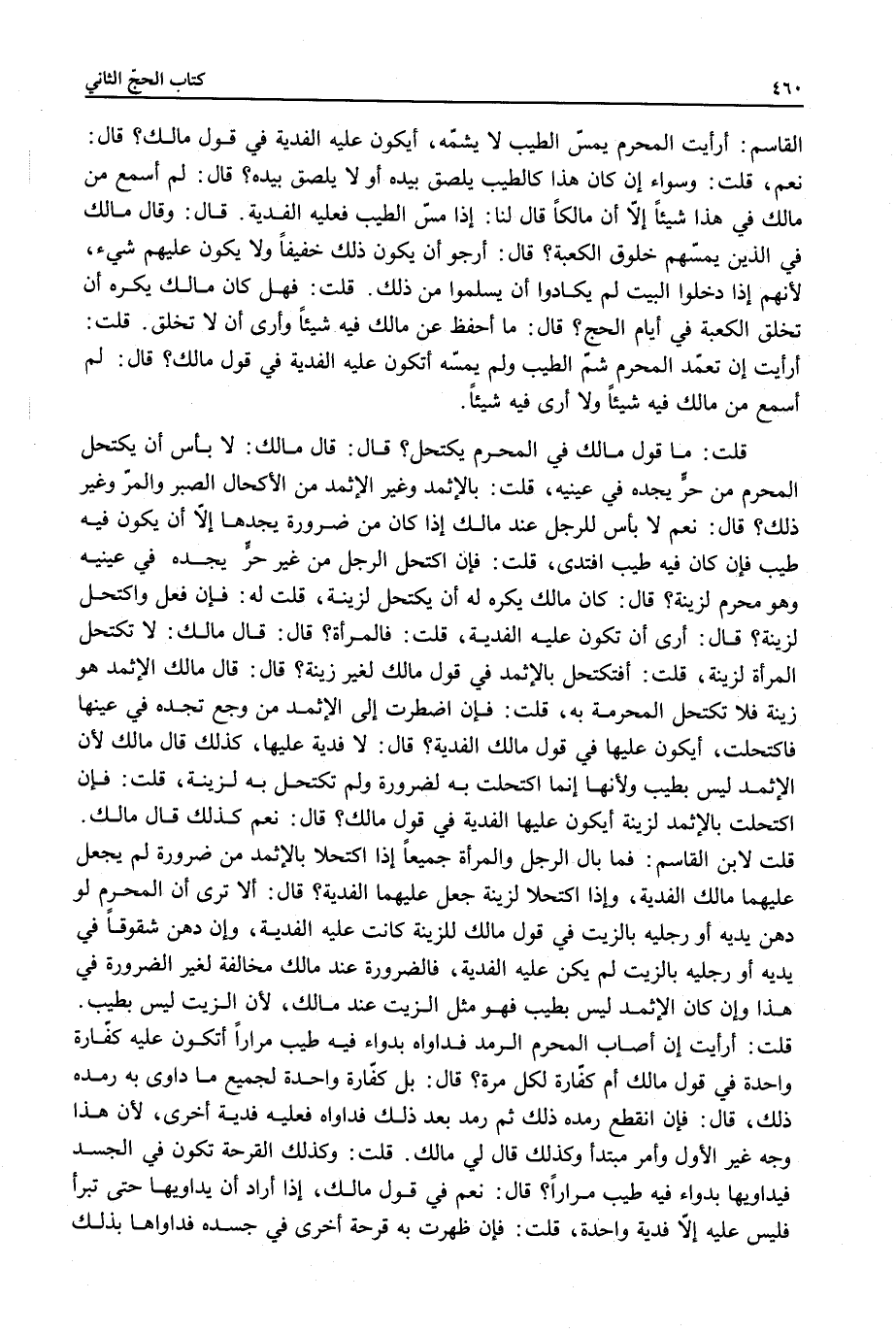 قَالَ: نَعَمْ كَذَلِكَ قَالَ مَالِكٌ. قُلْت لِابْنِ الْقَاسِمِ: فَمَا بَالُ الرَّجُلِ وَالْمَرْأَةِ جَمِيعًا إذَا اكْتَحَلَا بِالْإِثْمِدِ مِنْ ضَرُورَةٍ لَمْ يَجْعَلْ عَلَيْهِمَا مَالِكٌ الْفِدْيَةَ، وَإِذَا اكْتَحَلَا لِزِينَةٍ جَعَلَ عَلَيْهِمَا الْفِدْيَةَ؟