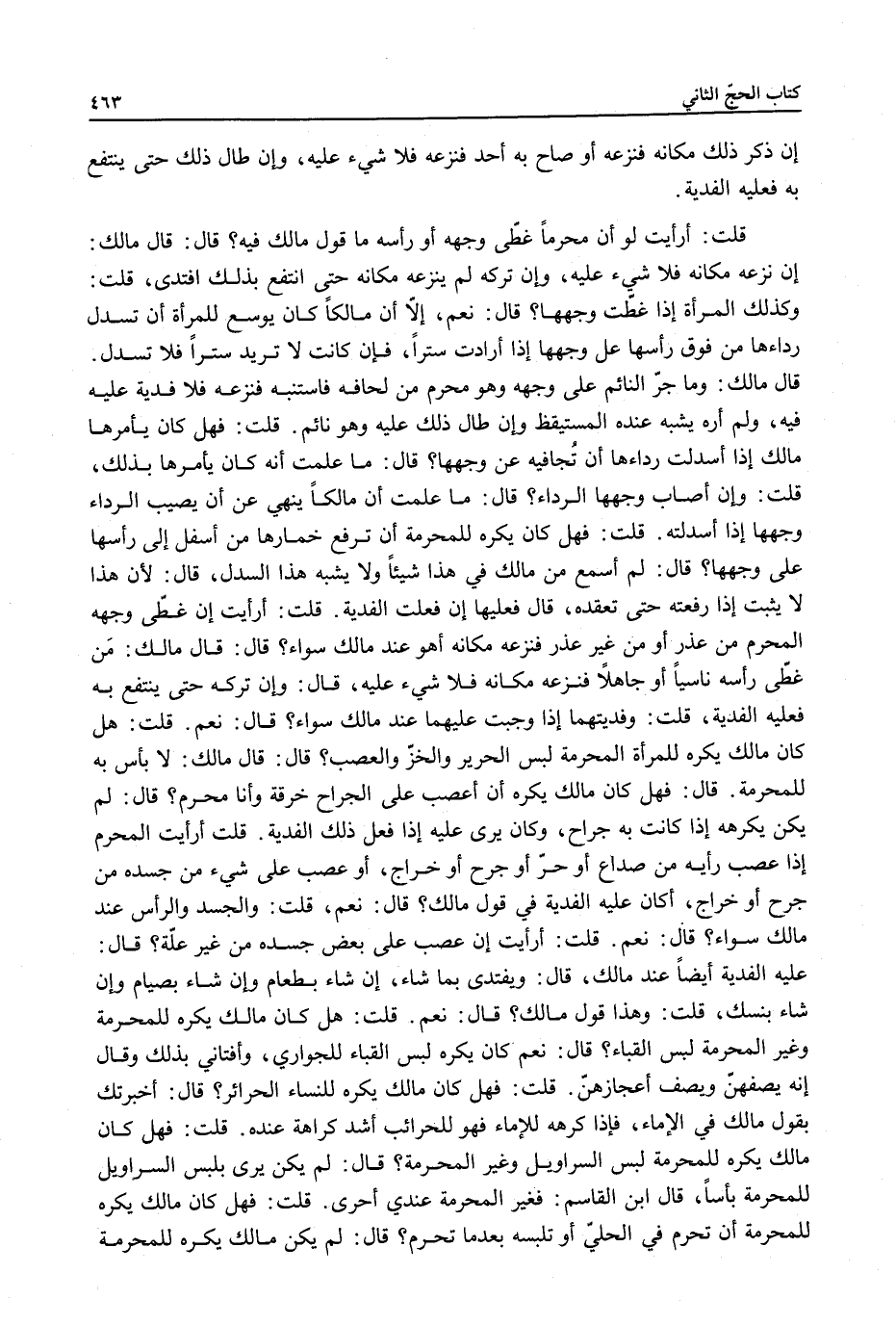 قَالَ: أَخْبَرْتُك بِقَوْلِ مَالِكٍ فِي الْإِمَاءِ، فَإِذَا كَرِهَهُ لِلْإِمَاءِ فَهُوَ لِلْحَرَائِرِ أَشَدُّ كَرَاهَةً عِنْدَهُ. قُلْت: فَهَلْ كَانَ مَالِكٌ يَكْرَهُ لِلْمُحْرِمَةِ لِبْسَ السَّرَاوِيلِ وَغَيْرِ الْمُحْرِمَةِ؟