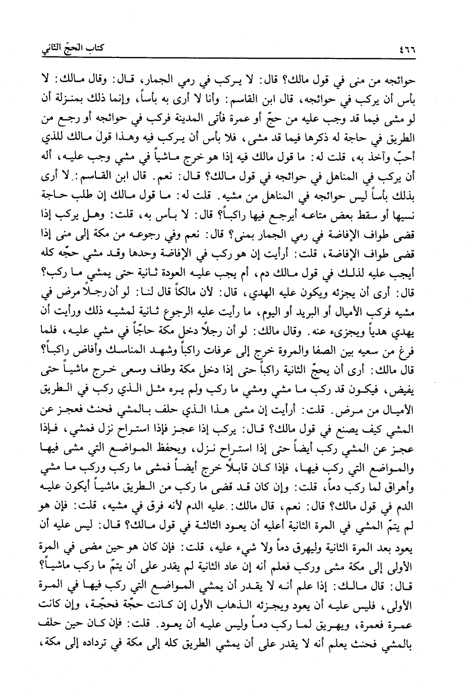 قَالَ: نَعَمْ وَفِي رُجُوعِهِ مِنْ مَكَّةَ إلَى مِنًى إذَا قَضَى طَوَافَ الْإِفَاضَةِ، قُلْت: أَرَأَيْت إنْ هُوَ رَكِبَ فِي الْإِفَاضَةِ وَحْدَهَا وَقَدْ مَشَى حَجَّهُ كُلَّهُ أَيَجِبُ عَلَيْهِ لِذَلِكَ فِي قَوْلِ مَالِكٍ دَمٌ، أَمْ يَجِبُ عَلَيْهِ الْعَوْدَةُ ثَانِيَةً حَتَّى يَمْشِيَ مَا رَكِبَ؟