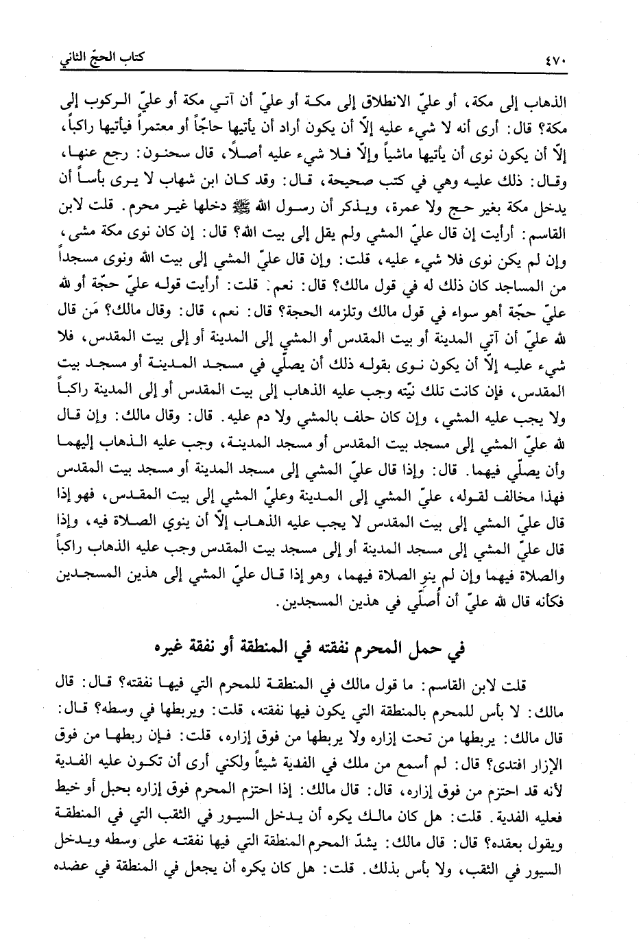 ِ قُلْت لِابْنِ الْقَاسِمِ: مَا قَوْلُ مَالِكٍ فِي الْمِنْطَقَةِ لِلْمُحْرِمِ الَّتِي فِيهَا نَفَقَتُهُ؟