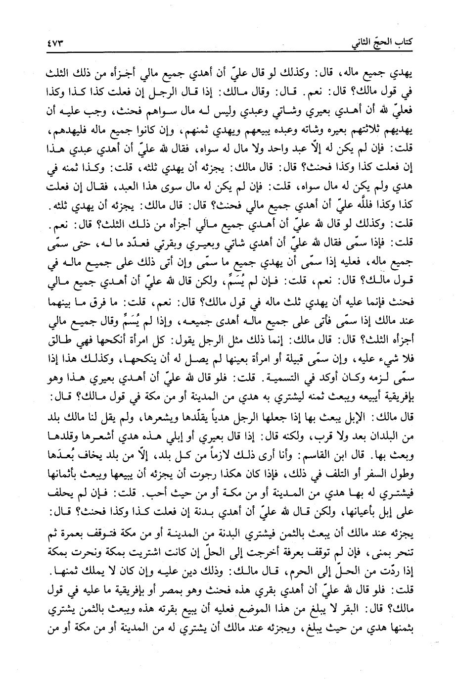قَالَ: وَقَالَ مَالِكٌ: إذَا قَالَ الرَّجُلُ إنْ فَعَلْت كَذَا كَذَا وَكَذَا فَعَلَيَّ لِلَّهِ أَنْ أُهْدِيَ بَعِيرِي وَشَاتِي وَعَبْدِي وَلَيْسَ لَهُ مَالٌ سِوَاهُمْ فَحَنِثَ، وَجَبَ عَلَيْهِ أَنْ يُهْدِيَهُمْ ثَلَاثَتَهُمْ بَعِيرَهُ وَشَاتَه وَعَبْدَهُ يَبِيعُهُمْ وَيُهْدِي ثَمَنَهُمْ، وَإِنْ كَانُوا جَمِيعَ مَالِهِ فَلْيَهْدِهِمْ، قُلْت: فَإِنْ لَمْ يَكُنْ لَهُ إلَّا عَبْدٌ وَاحِدٌ وَلَا مَالَ لَهُ سِوَاهُ، فَقَالَ: لِلَّهِ عَلَيَّ أَنْ أُهْدِيَ عَبْدِي هَذَا إنْ فَعَلْت كَذَا وَكَذَا فَحَنِثَ؟