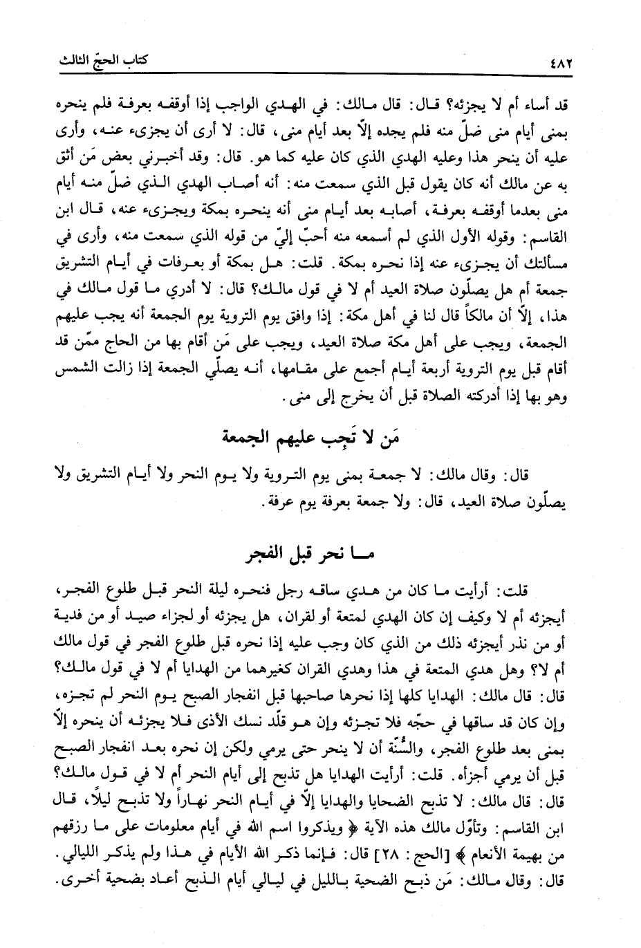 ُ قَالَ: وَقَالَ مَالِكٌ: لَا جُمُعَةَ بِمِنًى يَوْمَ التَّرْوِيَةِ وَلَا يَوْمَ النَّحْرِ وَلَا أَيَّامَ التَّشْرِيقِ وَلَا يُصَلُّونَ صَلَاةَ الْعِيدِ، قَالَ: وَلَا جُمُعَةَ بِعَرَفَةَ يَوْمَ عَرَفَةَ.