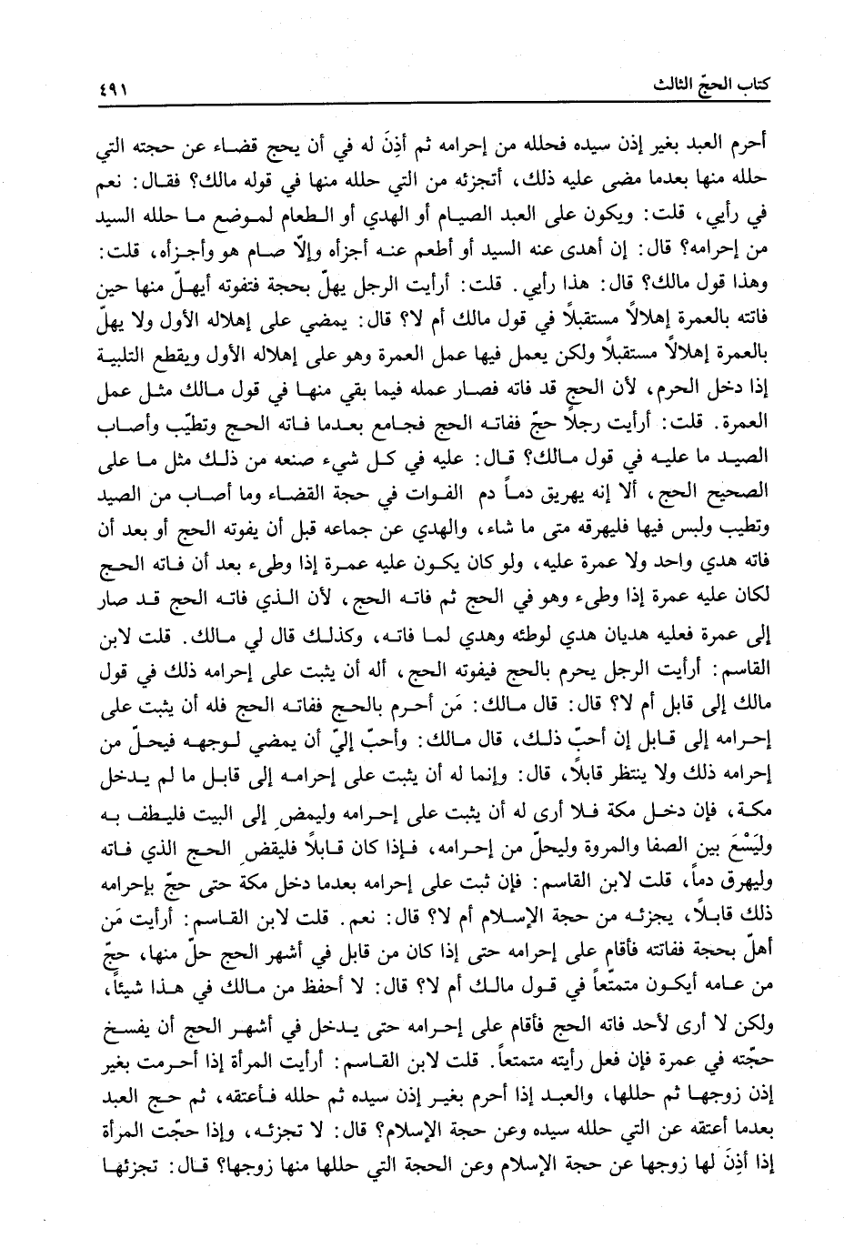 قُلْت لِابْنِ الْقَاسِمِ: أَرَأَيْت الْمَرْأَةَ إذَا أَحْرَمَتْ بِغَيْرِ إذْنِ زَوْجِهَا ثُمَّ حَلَّلَهَا، وَالْعَبْدَ إذَا أَحْرَمَ بِغَيْرِ إذْنِ سَيِّدِهِ ثُمَّ حَلَّلَهُ فَأَعْتَقَهُ، ثُمَّ حَجَّ الْعَبْدُ بَعْدَمَا أَعْتَقَهُ عَنْ الَّتِي حَلَّلَهُ سَيِّدُهُ وَعَنْ حَجَّةِ الْإِسْلَامِ؟