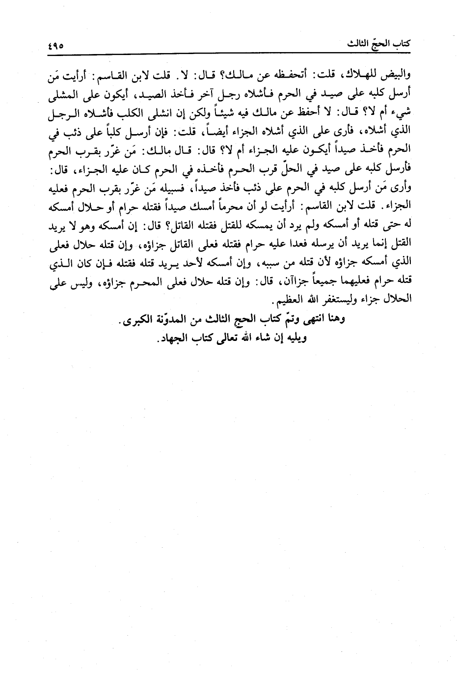 قَالَ: لَا أَحْفَظُ عَنْ مَالِكٍ فِيهِ شَيْئًا وَلَكِنْ إنْ انْشَلَى الْكَلْبُ فَأَشْلَاهُ الرَّجُلُ الَّذِي أَشْلَاهُ، فَأَرَى عَلَى الَّذِي أَشْلَاهُ الْجَزَاءَ أَيْضًا، قُلْت: فَإِنْ أَرْسَلَ كَلْبًا عَلَى ذِئْبٍ فِي الْحَرَمِ فَأَخَذَ صَيْدًا أَيَكُونُ عَلَيْهِ الْجَزَاءُ أَمْ لَا؟