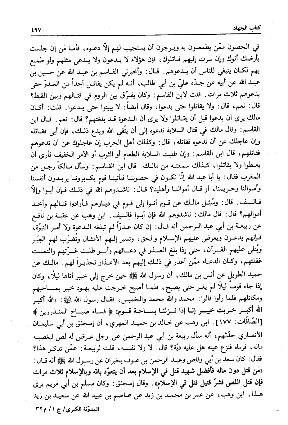 قَالَ: وَأَخْبَرَنِي الْقَاسِمُ بْنُ عَبْدِ اللَّهِ عَنْ حُسَيْنِ بْنِ عَبْدِ اللَّهِ عَنْ أَبِيهِ عَنْ جَدِّهِ عَلِيِّ بْنِ أَبِي طَالِبٍ، أَنَّهُ لَمْ يَكُنْ يُقَاتِلُ أَحَدًا مِنْ الْعَدُوِّ حَتَّى يَدْعُوهُمْ ثَلَاثَ مَرَّاتٍ. قُلْت لِابْنِ الْقَاسِمِ: وَكَانَ يُفَرِّقُ بَيْنَ الرُّومِ فِي قِتَالِهِمْ وَبَيْنَ الْقِبْطِ؟