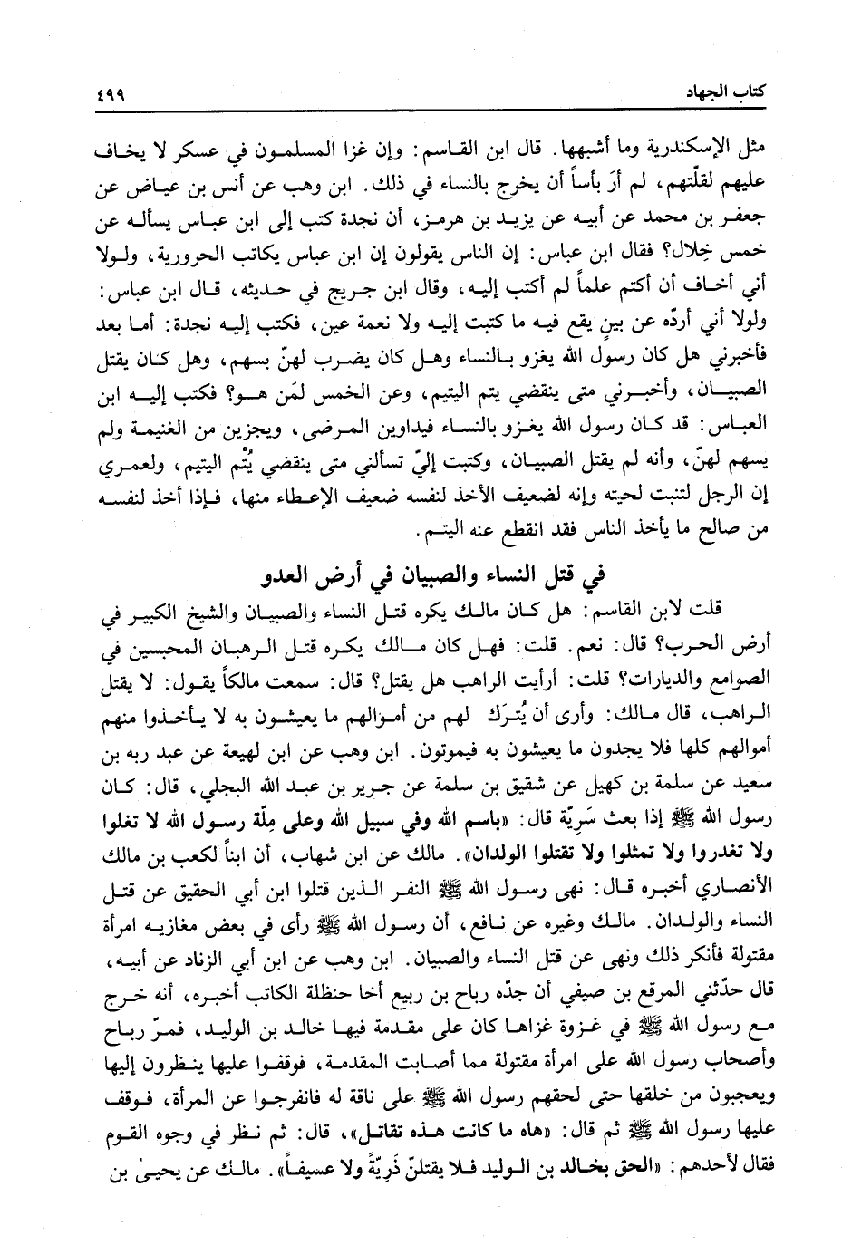 قَالَ: سَمِعْت مَالِكًا يَقُولُ لَا يُقْتَلُ الرَّاهِبُ، قَالَ مَالِكٌ: وَأَرَى أَنْ يُتْرَكَ لَهُمْ مِنْ أَمْوَالِهِمْ مَا يَعِيشُونَ بِهِ لَا يَأْخُذُوا مِنْهُمْ أَمْوَالَهُمْ كُلَّهَا فَلَا يَجِدُونَ مَا يَعِيشُونَ بِهِ فَيَمُوتُونَ ابْنُ وَهْبٍ عَنْ ابْنِ لَهِيعَةَ عَنْ عَبْدِ رَبِّهِ بْنِ سَعِيدٍ عَنْ سَلَمَةَ بْنِ كُهَيْلٍ عَنْ شَقِيقِ بْنِ سَلَمَةَ عَنْ جَرِيرِ بْنِ عَبْدِ اللَّهِ الْبَجَلِيِّ قَالَ: «كَانَ رَسُولُ اللَّهِ - صَلَّى اللَّهُ عَلَيْهِ وَسَلَّمَ - إذَا بَعَثَ سَرِيَّةً قَالَ بِاسْمِ اللَّهِ وَفِي سَبِيلِ اللَّهِ وَعَلَى مِلَّةِ رَسُولِ اللَّهِ لَا تَغْلُوا وَلَا تَغْدِرُوا وَلَا تُمَثِّلُوا وَلَا تَقْتُلُوا الْوِلْدَانَ» . مَالِكٌ عَنْ ابْنِ شِهَابٍ، أَنَّ ابْنًا لِكَعْبِ بْنِ مَالِكٍ الْأَنْصَارِيِّ أَخْبَرَهُ قَالَ: «نَهَى رَسُولُ اللَّهِ - صَلَّى اللَّهُ عَلَيْهِ وَسَلَّمَ - النَّفَرَ الَّذِينَ قَتَلُوا ابْنَ أَبِي الْحَقِيقِ عَنْ قَتْلِ النِّسَاءِ وَالْوِلْدَانِ» مَالِكٌ وَغَيْرُهُ عَنْ نَافِعٍ «أَنَّ رَسُولَ اللَّهِ - صَلَّى اللَّهُ عَلَيْهِ وَسَلَّمَ - رَأَى فِي بَعْضِ مَغَازِيهِ امْرَأَةً مَقْتُولَةً فَأَنْكَرَ ذَلِكَ وَنَهَى عَنْ قَتْلِ النِّسَاءِ وَالصِّبْيَانِ.» ابْنُ وَهْبٍ عَنْ ابْنِ أَبِي الزِّنَادِ عَنْ أَبِيهِ، قَالَ حَدَّثَنِي الْمُرَقَّعُ بْنُ صَيْفِيٍّ أَنَّ جَدَّهُ رَبَاحَ بْنَ رَبِيعٍ أَخَا حَنْظَلَةَ الْكَاتِب أَخْبَرَهُ، أَنَّهُ خَرَجَ مَعَ رَسُولِ اللَّهِ - صَلَّى اللَّهُ عَلَيْهِ وَسَلَّمَ - فِي غَزْوَةٍ غَزَاهَا كَانَ عَلَى مُقَدِّمَةٍ فِيهَا خَالِدُ بْنُ الْوَلِيدِ، فَمَرَّ رَبَاحٌ وَأَصْحَابُ رَسُولِ اللَّهِ عَلَى امْرَأَةٍ مَقْتُولَةٍ مِمَّا أَصَابَتْ الْمُقَدِّمَةَ، فَوَقَفُوا عَلَيْهَا يَنْظُرُونَ إلَيْهَا وَيَعْجَبُونَ مِنْ خَلْقِهَا حَتَّى لَحِقَهُمْ رَسُولُ اللَّهِ - صَلَّى اللَّهُ عَلَيْهِ وَسَلَّمَ - عَلَى نَاقَةٍ لَهُ فَانْفَرَجُوا عَنْ الْمَرْأَةِ، فَوَقَفَ عَلَيْهَا رَسُولُ اللَّهِ - صَلَّى اللَّهُ عَلَيْهِ وَسَلَّمَ - ثُمَّ قَالَ: «هَاهْ مَا كَانَتْ هَذِهِ تُقَاتَلُ، قَالَ: ثُمَّ نَظَرَ فِي وُجُوهِ الْقَوْمِ فَقَالَ لِأَحَدِهِمْ الْحَقْ بِخَالِدِ بْنِ الْوَلِيدِ فَلَا يَقْتُلَنَّ ذُرِّيَّةً وَلَا عَسِيفًا» .