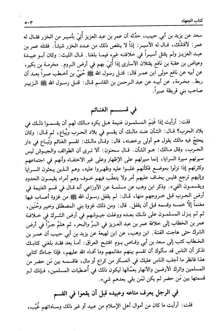 وَذَكَرَ ابْنُ وَهْبٍ عَنْ مَسْلَمَةَ عَنْ الْأَوْزَاعِيِّ أَنَّهُ قَالَ فِي قَسْمِ الْغَنِيمَةِ فِي أَرْضِ الْحَرْبِ قَبْلَ خُرُوجِهِمْ مِنْهَا، قَالَ: لَمْ يَقْفِلْ رَسُولُ اللَّهِ - صَلَّى اللَّهُ عَلَيْهِ وَسَلَّمَ - مِنْ غَزْوَةٍ أَصَابَ فِيهَا مَغْنَمًا إلَّا خَمَّسَهُ وَقَسَّمَهُ قَبْلَ أَنْ يَقْفِلَ. قَالَ: وَمِنْ ذَلِكَ غَزْوَةُ بَنِي الْمُصْطَلِقِ وَخَيْبَرَ وَحُنَيْنٍ، ثُمَّ لَمْ يَزَلْ الْمُسْلِمُونَ عَلَى ذَلِكَ بَعْدَهُ وَوَغَلَتْ جُيُوشُهُمْ فِي أَرْضِ الشِّرْكِ فِي خِلَافَةِ عُمَرَ بْنِ الْخَطَّابِ إلَى خِلَافَةِ عُمَرَ بْنِ عَبْدِ الْعَزِيزِ فِي الْبَرِّ وَالْبَحْرِ، ثُمَّ هَلُمَّ جَرًّا فِي أَرْضِ الشِّرْكِ حَتَّى هَاجَتْ الْفِتْنَةُ. ابْنُ وَهْبٍ، عَنْ ابْنِ لَهِيعَةَ عَنْ يَزِيدَ بْنِ أَبِي حَبِيبٍ أَنَّ عُمَرَ بْنَ الْخَطَّابِ كَتَبَ إلَى سَعْدِ بْنِ أَبِي وَقَّاصٍ يَوْمَ افْتَتَحَ الْعِرَاقَ: أَمَّا بَعْدُ فَقَدْ بَلَغَنِي كِتَابُك تَذْكُرُ أَنَّ النَّاسَ قَدْ سَأَلُوك أَنْ تُقَسِّمَ بَيْنَهُمْ مَغَانِمَهُمْ وَمَا أَفَاءَ اللَّهُ عَلَيْهِمْ، فَإِذَا جَاءَك كِتَابِي هَذَا فَانْظُرْ مَا أَجْلَبَ النَّاسُ عَلَيْك فِي الْعَسْكَرِ مِنْ كُرَاعٍ أَوْ مَالٍ، فَاقْسِمْهُ بَيْنَ مَنْ حَضَرَ مِنْ الْمُسْلِمِينَ وَاتْرُكْ الْأَرْضِينَ وَالْأَنْهَارَ بِعُمَّالِهَا لِيَكُونَ ذَلِكَ فِي أَعْطِيَاتِ الْمُسْلِمِينَ، فَإِنَّك لَوْ قَسَّمْتهَا بَيْنَ مَنْ حَضَرَ لَمْ يَكُنْ لِمَنْ بَقِيَ بَعْدَهُمْ شَيْءٌ.