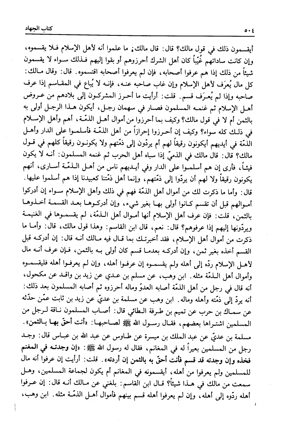 قَالَ ابْنُ الْقَاسِمِ: وَهَذَا قَوْلُ مَالِكٍ، قَالَ: وَأَمَّا مَا ذَكَرْت مِنْ أَمْوَالِ أَهْل الْإِسْلَامِ، فَقَدْ أَخْبَرْتُك بِمَا قَالَ فِيهِ مَالِكٌ إنَّهُ قَالَ: إنْ أَدْرَكَهُ قَبْلَ الْقَسْمِ أَخَذَهُ بِغَيْرِ ثَمَنٍ، وَإِنْ أَدْرَكَهُ بَعْدَمَا قُسِّمَ كَانَ أَوْلَى بِهِ بِالثَّمَنِ، فَإِنْ عَرَفَ أَنَّهُ مَالٌ لِأَهْلِ الْإِسْلَامِ رَدَّهُ إلَى أَهْلِهِ وَلَمْ يَقْسِمُوهُ إنْ عَرَفُوا أَهْلَهُ، وَإِنْ لَمْ يَعْرِفُوا أَهْلَهُ فَلْيَقْسِمُوهُ وَأَمْوَالُ أَهْلِ الذِّمَّةِ مِثْلُهُ. ابْنُ وَهْبٍ، عَنْ مُسْلِمِ بْنِ عَدِيٍّ عَنْ زَيْدِ بْنِ وَاقِدٍ عَنْ مَكْحُولٍ، أَنَّهُ قَالَ فِي رَجُلٍ مِنْ أَهْلِ الذِّمَّةِ أَصَابَهُ الْعَدُوُّ، وَمَالَهُ أَحْرَزُوهُ ثُمَّ أَصَابَهُ الْمُسْلِمُونَ بَعْدَ ذَلِكَ: أَنَّهُ يُرَدُّ إلَى ذِمَّتِهِ وَأَهْلِهِ وَمَالِهِ. ابْنُ وَهْبٍ عَنْ مَسْلَمَةَ بْنِ عَدِيٍّ عَنْ زَيْدِ بْنِ ثَابِتٍ عَمَّنْ حَدَّثَهُ عَنْ سِمَاكِ بْنِ حَرْبٍ عَنْ تَمِيمِ بْنِ طَرَفَةَ الطَّائِيِّ قَالَ: أَصَابَ الْمُسْلِمُونَ نَاقَةً لِرَجُلٍ مِنْ الْمُسْلِمِينَ اشْتَرَاهَا بَعْضُهُمْ، فَقَالَ رَسُولُ اللَّهِ - صَلَّى اللَّهُ عَلَيْهِ وَسَلَّمَ - لِصَاحِبِهَا: «أَنْتَ أَحَقُّ بِهَا بِالثَّمَنِ» . مَسْلَمَةَ بْنِ عَدِيٍّ عَنْ عَبْدِ الْمَلِكِ بْنِ مَيْسَرَةَ عَنْ طَاوُسٍ عَنْ عَبْدِ اللَّهِ بْنِ عَبَّاسٍ قَالَ: وَجَدَ رَجُلٌ مِنْ الْمُسْلِمِينَ بَعِيرًا لَهُ فِي الْمَغَانِمِ، فَقَالَ لَهُ رَسُولُ اللَّهِ - صَلَّى اللَّهُ عَلَيْهِ وَسَلَّمَ -: «إنْ وَجَدْتَهُ فِي الْمَغْنَمِ فَخُذْهُ وَإِنْ وَجَدْتَهُ قَدْ قُسِّمَ فَأَنْتَ أَحَقُّ بِهِ بِالثَّمَنِ إنْ أَرْدَتْهُ» .