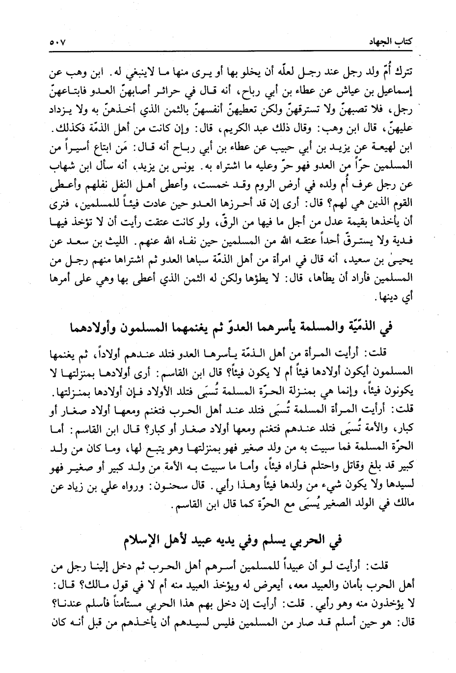 فِي الذِّمِّيَّةِ وَالْمُسْلِمَةِ يَأْسِرُهُمَا الْعَدُوُّ ثُمَّ يَغْنَمُهُمَا الْمُسْلِمُونَ وَأَوْلَادَهُمَا قُلْت: أَرَأَيْت الْمَرْأَةَ مِنْ أَهْلِ الذِّمَّةِ يَأْسِرُهَا الْعَدُوُّ فَتَلِدُ عِنْدَهُمْ أَوْلَادًا، ثُمَّ يَغْنَمُهَا الْمُسْلِمُونَ أَيَكُونُ أَوْلَادُهَا فَيْئًا أَمْ لَا يَكُونُ فَيْئًا؟