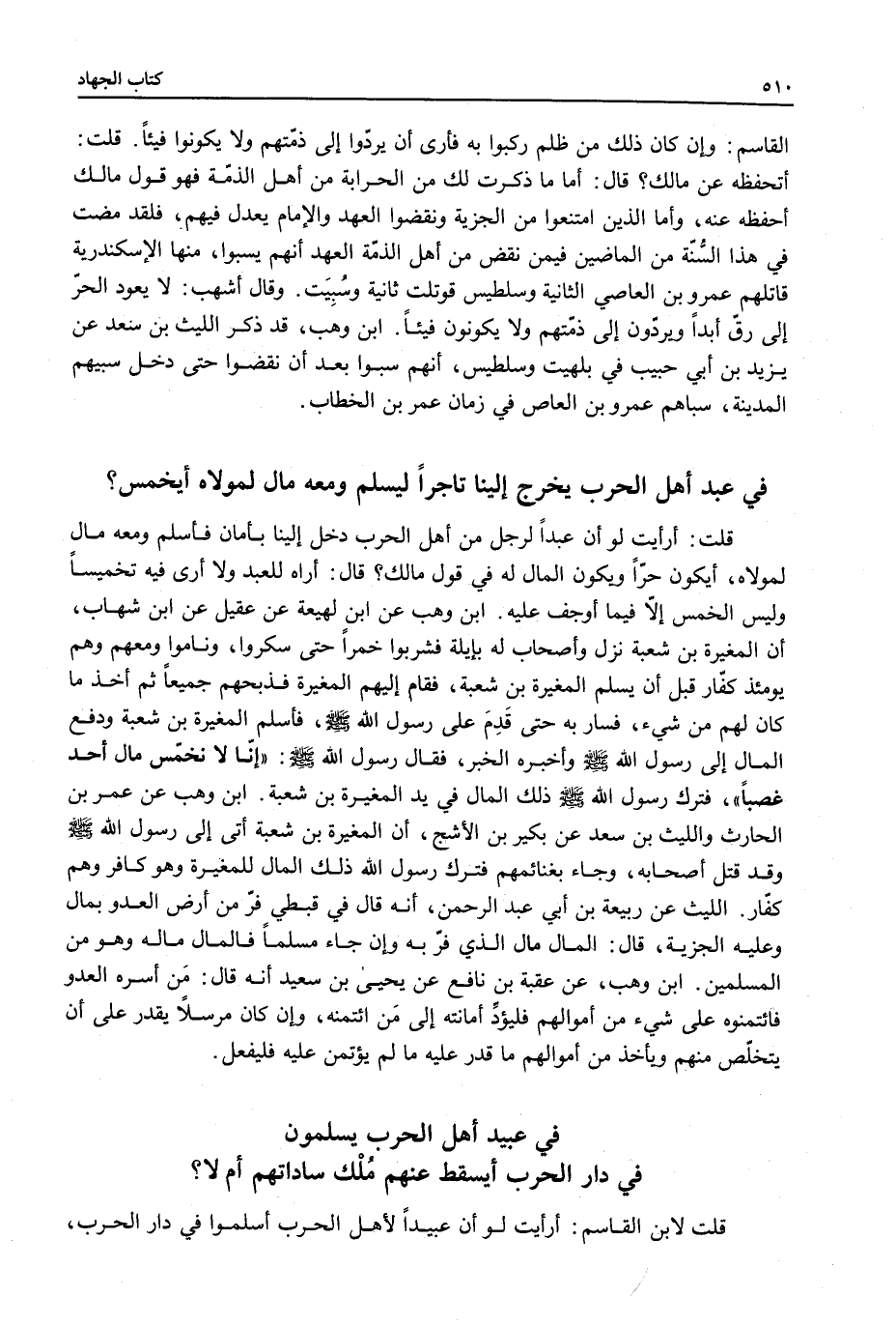 قَالَ: أَمَّا مَا ذَكَرْت لَك مِنْ الْحِرَابَةِ مِنْ أَهْلِ الذِّمَّةِ فَهُوَ قَوْلُ مَالِكٍ أَحْفَظُهُ عَنْهُ، وَأَمَّا الَّذِينَ امْتَنَعُوا مِنْ الْجِزْيَةِ وَنَقَضُوا الْعَهْدَ وَالْإِمَامُ يَعْدِلُ فِيهِمْ، فَلَقَدْ مَضَتْ فِي هَذَا السُّنَّةُ مِنْ الْمَاضِينَ فِيمَنْ نَقَضَ مِنْ أَهْلِ الذِّمَّةِ الْعَهْدَ أَنَّهُمْ يُسْبَوْا، مِنْهَا الْإِسْكَنْدَرِيَّة قَاتَلَهُمْ عَمْرُو بْنُ الْعَاصِ الثَّانِيَةُ وَسُلْطَيْسُ قُوتِلَتْ ثَانِيَةً وَسُبِيَتْ. وَقَالَ أَشْهَبُ: لَا يَعُودُ الْحُرُّ إلَى رِقٍّ أَبَدًا وَيُرَدُّونَ إلَى ذِمَّتِهِمْ وَلَا يَكُونُونَ فَيْئًا. ابْنُ وَهْبٍ، قَدْ ذَكَرَ اللَّيْثُ بْنُ سَعْدٍ عَنْ يَزِيدَ بْنِ أَبِي حَبِيبٍ فِي بِلَهِيبِ وَسُلْطَيْسَ، أَنَّهُمْ سُبُوا بَعْدَ أَنْ نَقَضُوا حَتَّى دَخَلَ سَبْيُهُمْ الْمَدِينَةَ، سَبَاهُمْ عَمْرُو بْنُ الْعَاصِ فِي زَمَانِ عُمَرَ بْنِ الْخَطَّابِ.