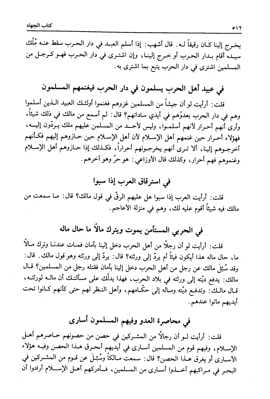فِي عَبِيدِ أَهْلِ الْحَرْبِ يُسْلِمُونَ فِي دَارِ الْحَرْبِ فَيَغْنِمُهُمْ الْمُسْلِمُونَ قُلْت: أَرَأَيْت لَوْ أَنَّ جَيْشًا مِنْ الْمُسْلِمِينَ غَزَوْهُمْ فَغَنِمُوا أُولَئِكَ الْعَبِيدَ الَّذِينَ أَسْلَمُوا وَهُمْ فِي دَارِ الْحَرْبِ بِعَدُوِّهِمْ فِي أَيْدِي سَادَاتِهِمْ؟