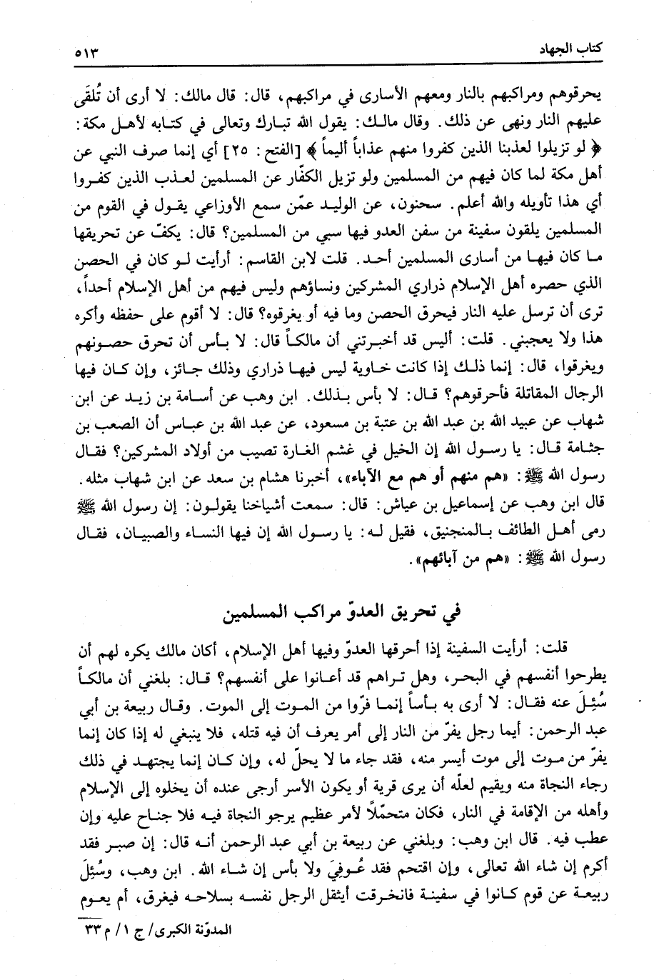 يُحْرِقُوهُمْ وَمَرَاكِبَهُمْ بِالنَّارِ وَمَعَهُمْ الْأُسَارَى فِي مَرَاكِبِهِمْ، قَالَ: قَالَ مَالِكٌ: لَا أَرَى أَنْ تُلْقَى عَلَيْهِمْ النَّارُ وَنَهَى عَنْ ذَلِكَ. وَقَالَ مَالِكٌ: يَقُولُ اللَّهُ تَبَارَكَ وَتَعَالَى فِي كِتَابِهِ لِأَهْلِ مَكَّةَ: {لَوْ تَزَيَّلُوا لَعَذَّبْنَا الَّذِينَ كَفَرُوا مِنْهُمْ عَذَابًا أَلِيمًا} [الفتح: 25] أَيْ إنَّمَا صُرِفَ النَّبِيُّ عَنْ أَهْلِ مَكَّةَ لِمَا كَانَ فِيهِمْ مِنْ الْمُسْلِمِينَ وَلَوْ تَزَيَّلَ الْكُفَّارُ عَنْ الْمُسْلِمِينَ لَعُذِّبَ الَّذِينَ كَفَرُوا أَيْ هَذَا تَأْوِيلُهُ وَاَللَّهُ أَعْلَمُ. سَحْنُونٌ، عَنْ الْوَلِيدِ عَمَّنْ سَمِعَ الْأَوْزَاعِيَّ يَقُولُ فِي الْقَوْمِ مِنْ الْمُسْلِمِينَ يَلْقَوْنَ سَفِينَةً مِنْ سُفُنِ الْعَدُوِّ فِيهَا سَبْيٌ مِنْ الْمُسْلِمِينَ؟ قَالَ: يُكَفُّ عَنْ تَحْرِيقِهَا مَا كَانَ فِيهَا مِنْ أُسَارَى الْمُسْلِمِينَ أَحَدٌ.