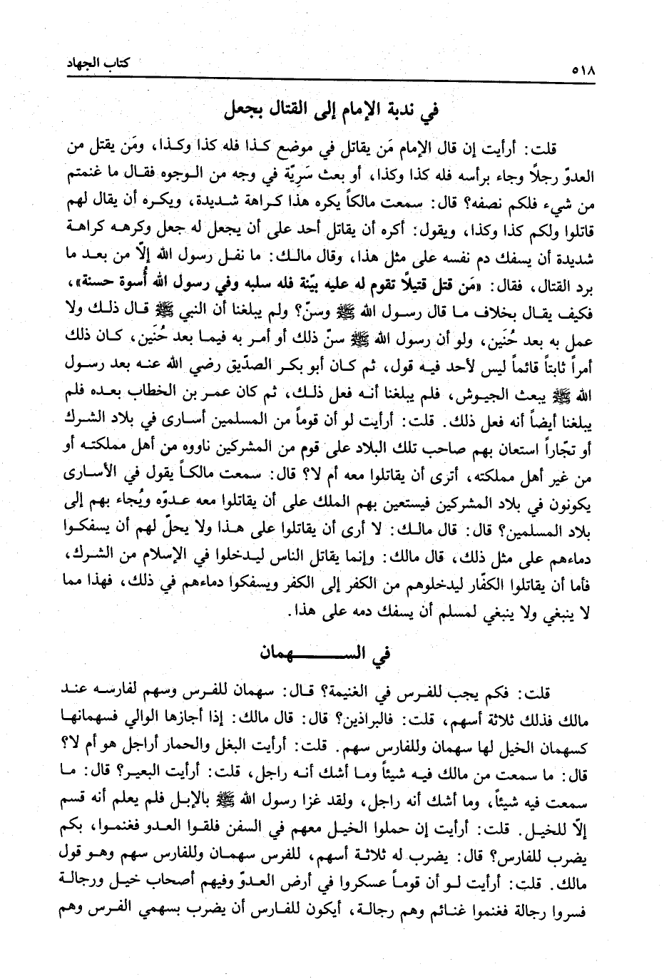 قَالَ: سَمِعْتُ مَالِكًا يَكْرَهُ هَذَا كَرَاهَةً شَدِيدَةً، وَيَكْرَهُ أَنْ يُقَالَ لَهُمْ قَاتِلُوا وَلَكُمْ كَذَا وَكَذَا، وَيَقُولُ: أَكْرَهُ أَنْ يُقَاتِلَ أَحَدٌ عَلَى أَنْ يُجْعَلَ لَهُ جُعْلٌ وَكَرِهَهُ كَرَاهَةً شَدِيدَةً أَنْ يَسْفِكَ دَمَ نَفْسِهِ عَلَى مِثْلِ هَذَا، وَقَالَ مَالِكٌ: مَا نَفَلَ رَسُولُ اللَّهِ إلَّا مِنْ بَعْدِ مَا بَرَدَ الْقِتَالُ، فَقَالَ: «مَنْ قَتَلَ قَتِيلًا تَقُومُ لَهُ عَلَيْهِ بَيِّنَةٌ فَلَهُ سَلَبُهُ» وَفِي رَسُولِ اللَّهِ أُسْوَةٌ حَسَنَةٌ "، فَكَيْفَ يُقَالُ بِخِلَافِ مَا قَالَ رَسُولُ اللَّهِ - صَلَّى اللَّهُ عَلَيْهِ وَسَلَّمَ - وَسَنَّ؟ وَلَمْ يَبْلُغْنَا أَنَّ النَّبِيَّ - صَلَّى اللَّهُ عَلَيْهِ وَسَلَّمَ - قَالَ ذَلِكَ وَلَا عَمِلَ بِهِ بَعْدَ حُنَيْنٍ، وَلَوْ أَنَّ رَسُولَ اللَّهِ - صَلَّى اللَّهُ عَلَيْهِ وَسَلَّمَ - سَنَّ ذَلِكَ أَوْ أَمَرَ بِهِ فِيمَا بَعْدَ حُنَيْنٍ، كَانَ ذَلِكَ أَمْرًا ثَابِتًا قَائِمًا لَيْسَ لِأَحَدٍ فِيهِ قَوْلٌ، ثُمَّ كَانَ أَبُو بَكْرٍ الصِّدِّيقُ - رَضِيَ اللَّهُ عَنْهُ - بَعْدَ رَسُولِ اللَّهِ - صَلَّى اللَّهُ عَلَيْهِ وَسَلَّمَ - يَبْعَثُ الْجُيُوشَ، فَلَمْ يَبْلُغْنَا أَنَّهُ فَعَلَ ذَلِكَ، ثُمَّ كَانَ عُمَرُ بْنُ الْخَطَّابِ بَعْدَهُ فَلَمْ يَبْلُغْنَا أَيْضًا أَنَّهُ فَعَلَ ذَلِكَ.