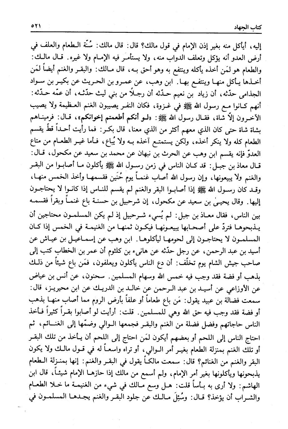 قَالَ بَكْرٌ: فَمَا رَأَيْت أَحَدًا قَطُّ يَقْسِمُ الطَّعَامَ كُلَّهُ وَلَا يُنْكِرُ أَخْذَهُ، وَلَكِنْ يَسْتَمْتِعُ آخِذُهُ بِهِ وَلَا يُبَاعُ، فَأَمَّا غَيْرُ الطَّعَامِ مِنْ مَتَاعِ الْعَدُوِّ فَإِنَّهُ يُقْسَمُ ابْنُ وَهْبٍ عَنْ الْحَارِثِ بْنِ نَبْهَانَ عَنْ مُحَمَّدِ بْنِ سَعِيدٍ عَنْ مَكْحُولٍ قَالَ: قَالَ مُعَاذُ بْنُ جَبَلٍ: قَدْ كَانَ النَّاسُ فِي زَمَنِ رَسُولِ اللَّهِ - صَلَّى اللَّهُ عَلَيْهِ وَسَلَّمَ - يَأْكُلُونَ مَا أَصَابُوا مِنْ الْبَقَرِ وَالْغَنَمِ وَلَا يَبِيعُونَهَا، وَأَنَّ رَسُولَ اللَّهِ أَصَابَ غَنَمًا يَوْمَ حُنَيْنٍ فَقَسَمَهَا وَأَخَذَ الْخُمُسَ مِنْهَا، وَقَدْ كَانَ رَسُولُ اللَّهِ - صَلَّى اللَّهُ عَلَيْهِ وَسَلَّمَ - إذَا أَصَابُوا الْبَقَرَ وَالْغَنَمَ لَمْ يَقْسِمْ لِلنَّاسِ إذَا كَانُوا لَا يَحْتَاجُونَ إلَيْهَا. وَقَالَ يَحْيَى بْنُ سَعِيدٍ عَنْ مَكْحُولٍ، إنَّ شُرَحْبِيلَ بْنَ حَسَنَةَ بَاعَ غَنَمًا وَبَقَرًا فَقَسَمَهُ بَيْنَ النَّاسِ، فَقَالَ مُعَاذُ بْنُ جَبَلٍ: لَمْ يُسِئْ شُرَحْبِيلُ إذْ لَمْ يَكُنْ الْمُسْلِمُونَ مُحْتَاجِينَ أَنْ يَذْبَحُوهَا فَتُرَدُّ عَلَى أَصْحَابِهَا يَبِيعُونَهَا فَيَكُونُ ثَمَنُهَا مِنْ الْغَنِيمَةِ فِي الْخُمْسِ إذَا كَانَ الْمُسْلِمُونَ لَا يَحْتَاجُونَ إلَى لُحُومِهَا لِيَأْكُلُوهَا.