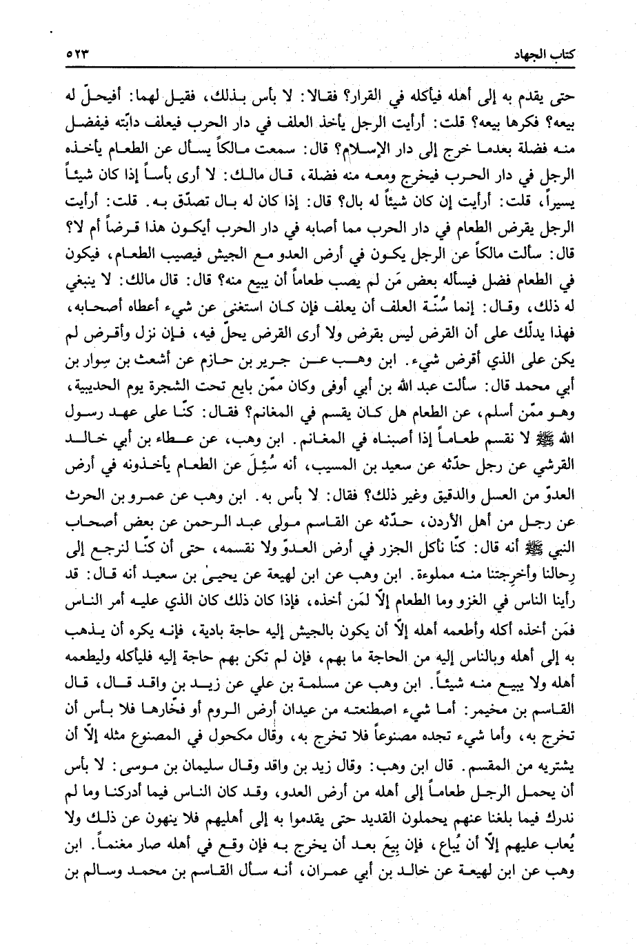 ابْنُ وَهْبٍ عَنْ عَمْرِو بْنِ الْحَارِثِ عَنْ رَجُلٍ مِنْ أَهْلِ الْأُرْدُنِّ، حَدَّثَهُ عَنْ الْقَاسِمِ مَوْلَى عَبْدِ الرَّحْمَنِ عَنْ بَعْضِ أَصْحَابِ النَّبِيِّ - صَلَّى اللَّهُ عَلَيْهِ وَسَلَّمَ - أَنَّهُ قَالَ: كُنَّا نَأْكُلُ الْجُزُرَ فِي أَرْضِ الْعَدُوِّ وَلَا نُقَسِّمُهُ، حَتَّى أَنْ كُنَّا لَنَرْجِعُ إلَى رِحَالِنَا وَأَخْرِجَتُنَا مِنْهُ مَمْلُوءَةٌ ابْنُ وَهْبٍ عَنْ ابْنِ لَهِيعَةَ عَنْ يَحْيَى بْنِ سَعِيدٍ أَنَّهُ قَالَ: قَدْ رَأَيْنَا النَّاسَ فِي الْغَزْوِ وَمَا الطَّعَامُ إلَّا لِمَنْ أَخَذَهُ، فَإِذَا كَانَ ذَلِكَ كَانَ الَّذِي عَلَيْهِ أَمْرُ النَّاسِ فَمَنْ أَخَذَهُ أَكَلَهُ وَأَطْعَمَهُ أَهْلَهُ إلَّا أَنْ يَكُونَ بِالْجَيْشِ إلَيْهِ حَاجَةٌ بَادِيَةٌ، فَإِنَّهُ يُكْرَهُ أَنْ يَذْهَبَ بِهِ إلَى أَهْلِهِ وَبِالنَّاسِ إلَيْهِ مِنْ الْحَاجَةِ مَا بِهِمْ، فَإِنْ لَمْ تَكُنْ بِهِمْ حَاجَةٌ إلَيْهِ فَلْيَأْكُلْهُ وَلْيُطْعِمْهُ أَهْلَهُ وَلَا يَبِيعُ مِنْهُ شَيْئًا ابْنُ وَهْبٍ عَنْ مَسْلَمَةَ بْنِ عَلِيٍّ عَنْ زَيْدِ بْنِ وَاقِدٍ قَالَ، قَالَ الْقَاسِمُ بْنُ مُخَيْمِرَةَ: أَمَّا شَيْءٌ اصْطَنَعْته مِنْ عِيدَانِ أَرْضِ الرُّومِ أَوْ فَخَّارِهَا فَلَا بَأْسَ أَنْ تَخْرُجَ بِهِ، وَأَمَّا شَيْءٌ تَجِدُهُ مَصْنُوعًا فَلَا تَخْرُجْ بِهِ.
