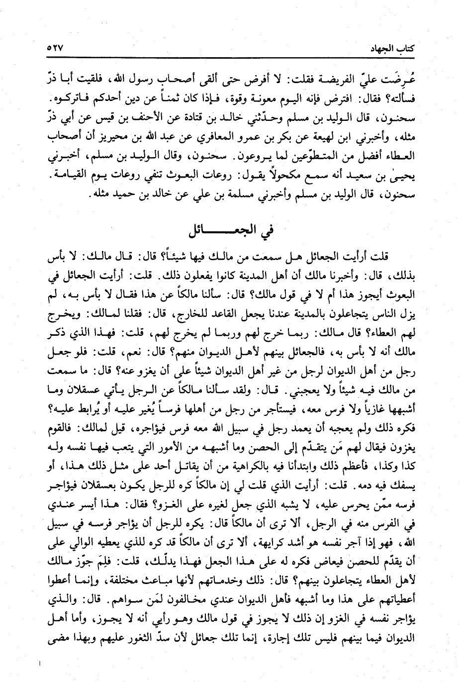 قُلْتُ: أَرَأَيْتَ الْجَعَائِلَ فِي الْبُعُوثِ أَيَجُوزُ هَذَا أَمْ لَا فِي قَوْلِ مَالِكٍ؟
