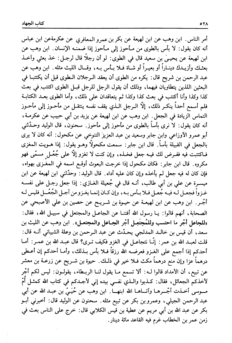 حَيْوَةُ بْنُ شُرَيْحٍ عَنْ زُرْعَةَ بْنِ مَعْشَرٍ عَنْ تُبَيْعٍ، أَنَّ الْأَمْدَادَ قَالُوا لَهُ: أَلَا تَسْمَعُ مَا يَقُولُ لَنَا الرُّبَطَاءُ، يَقُولُونَ: لَيْسَ لَكُمْ أَجْرٌ لِأَخْذِكُمْ الْجَعَائِلَ، فَقَالَ: كَذَبُوا وَاَلَّذِي نَفْسِي بِيَدِهِ إنِّي لَأَجِدُكُمْ فِي كِتَابِ اللَّهِ كَمَثَلِ أُمِّ مُوسَى أَخَذَتْ أَجْرَهَا وَآتَاهَا اللَّهُ ابْنَهَا. ابْنُ وَهْبٍ عَنْ حُيَيِّ بْنِ عَبْدِ اللَّهِ عَنْ أَبِي عَبْدِ الرَّحْمَنِ الْجِيلِيِّ، وَعَمْرِو بْنِ بَكْرٍ عَنْ تُبَيْعٍ مِثْلُهُ. سَحْنُونٌ عَنْ الْوَلِيدِ قَالَ: أَخْبَرَنِي أَبُو بَكْرٍ عَنْ عَبْدِ اللَّهِ بْنِ أَبِي مَرْيَمَ عَنْ عَطِيَّةَ بْنِ قَيْسٍ الْكِلَابِيِّ قَالَ: خَرَجَ عَلَى النَّاسِ بَعْثٌ فِي زَمَنِ عُمَرَ بْنِ الْخَطَّابِ غَرِمَ فِيهِ الْقَاعِدُ مِائَةَ دِينَارٍ.