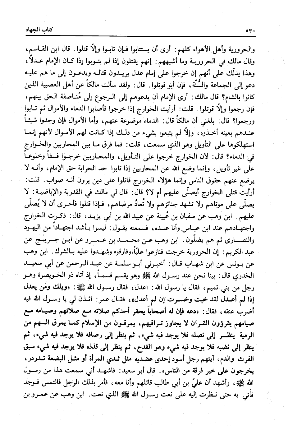 قُلْتُ: أَرَأَيْتَ قَتْلَى الْخَوَارِجِ أَيُصَلَّى عَلَيْهِمْ أَمْ لَا؟ قَالَ: قَالَ لِي مَالِكٌ فِي الْقَدَرِيَّةِ وَالْإِبَاضِيَّةِ: لَا يُصَلَّى عَلَى مَوْتَاهُمْ وَلَا تُشْهَدُ جَنَائِزُهُمْ وَلَا تُعَادُ مَرَضَاهُمْ، فَإِذَا قُتِلُوا فَأَحْرَى أَنْ لَا يُصَلَّى عَلَيْهِمْ. ابْنُ وَهْبٍ عَنْ سُفْيَانَ بْنِ عُيَيْنَةَ عَنْ عُبَيْدِ اللَّهِ بْنِ أَبِي يَزِيدَ، قَالَ: ذَكَرْت الْخَوَارِجَ وَاجْتِهَادَهُمْ عِنْدَ ابْنِ عَبَّاسٍ وَأَنَا عِنْدَهُ، فَسَمِعْتُهُ يَقُولُ: لَيْسُوا بِأَشَدَّ اجْتِهَادًا مِنْ الْيَهُودِ وَالنَّصَارَى ثُمَّ هُمْ يَضِلُّونَ. ابْنُ وَهْبٍ عَنْ مُحَمَّدِ بْنِ عَمْرٍو عَنْ ابْنِ جُرَيْجٍ عَنْ عَبْدِ الْكَرِيمِ: أَنَّ الْحَرُورِيَّةَ خَرَجَتْ فَنَازَعُوا عَلِيًّا وَفَارَقُوهُ وَشَهِدُوا عَلَيْهِ بِالشِّرْكِ.